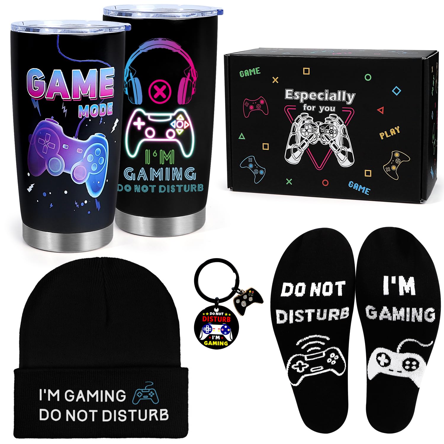Extensive Gamer Gift Set:Our game gift set includes 1* 20 oz wine glass; 1* knit hat; 1* socks; 1* keychain;1*greeting card and 1* gift box. Whether it's for men,teens,children,boys,son,husband,boyfriend,father,brothers,teachers,adults,uncles,friends,classmates,or gaming enthusiasts, its exquisite design makes it a great gift for game lovers