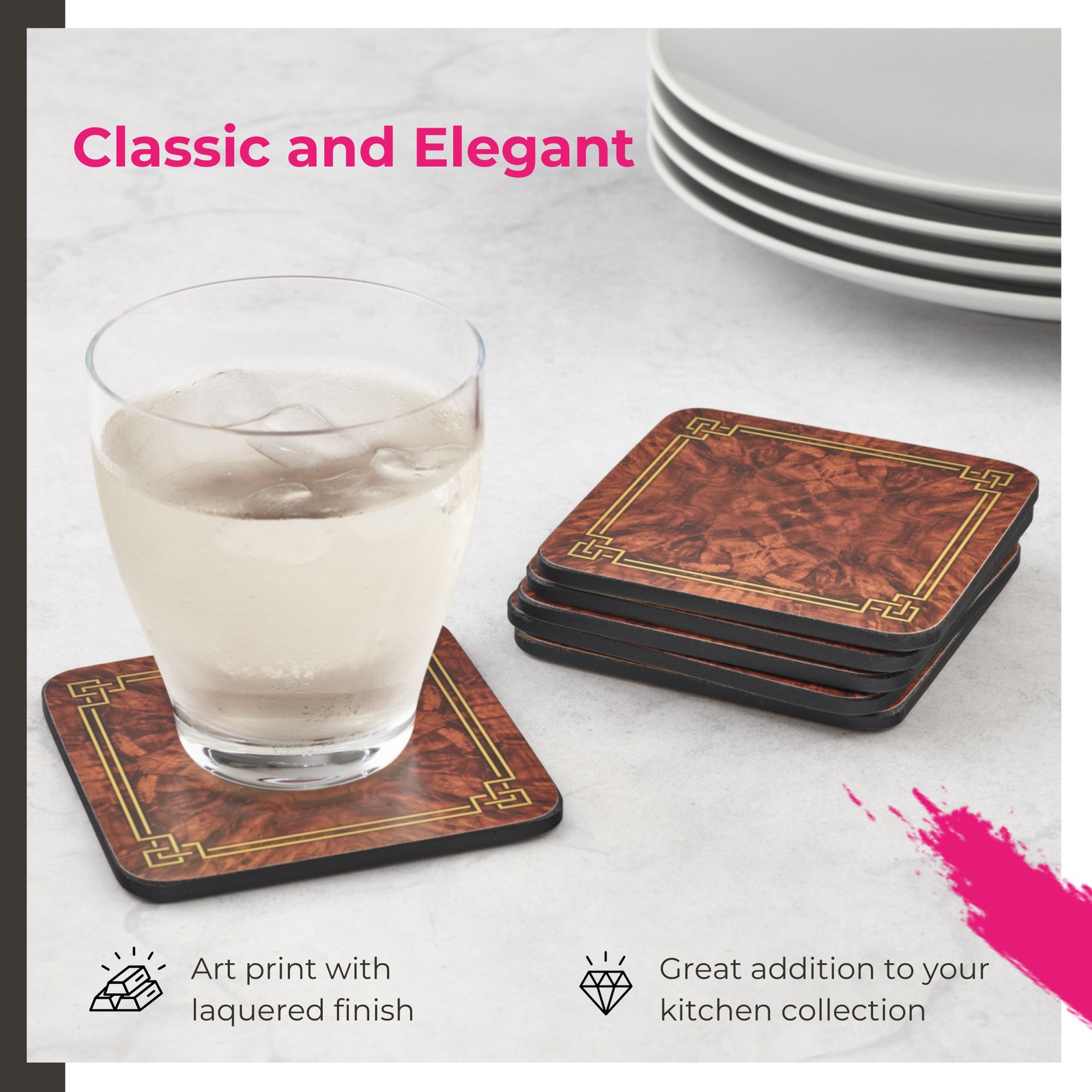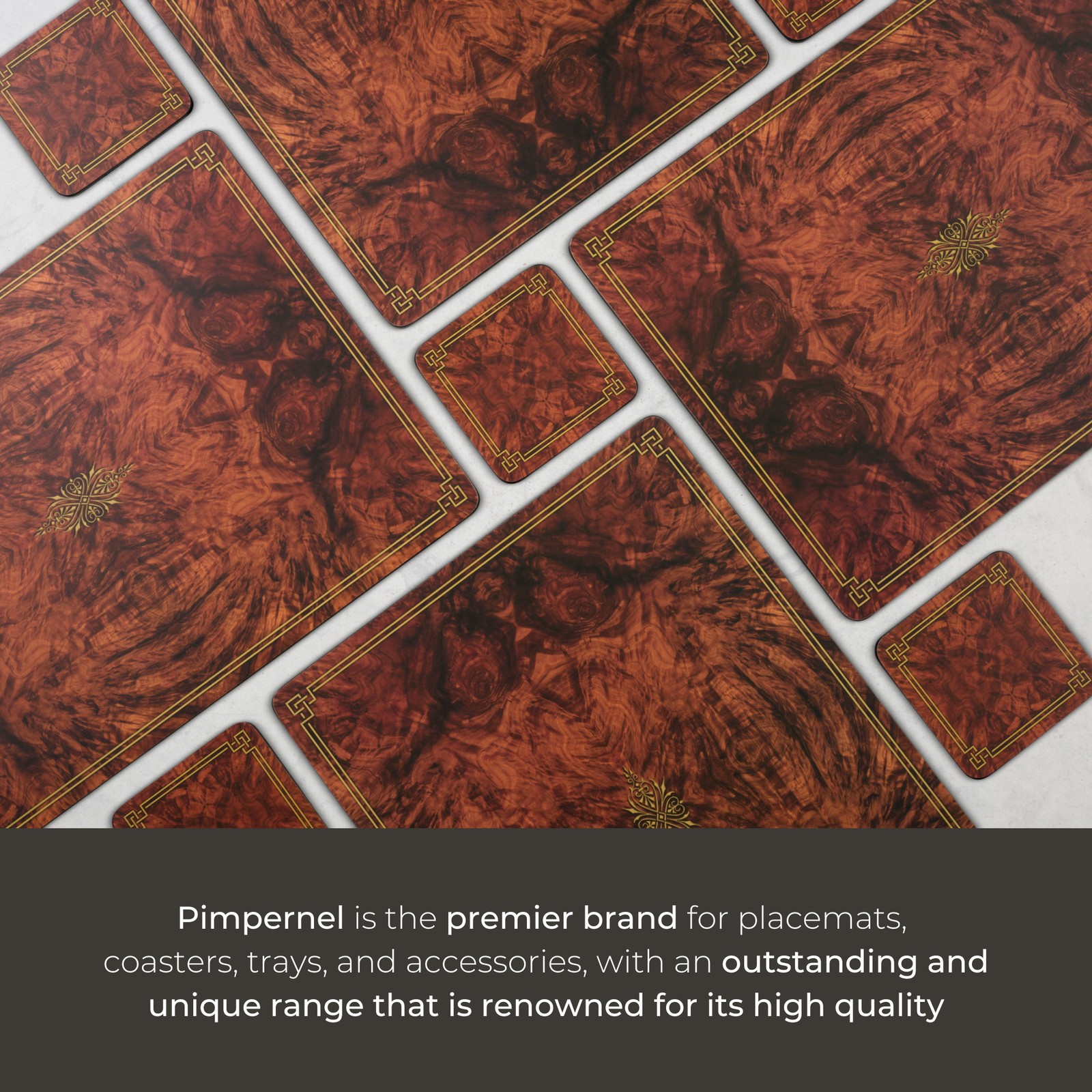 Add a simple, yet sophisticated feel to the table while protecting your tables from watermarks with this set of 6 Pimpernel Walnut Burlap Coasters. This square coasters set features a symmetrical walnut design with gold edging; pairs perfectly with any existing home, kitchen and bar decor. The premier brand for placemats and coasters, Pimpernel offers an array of beautiful designs for the tabletop. Guaranteeing quality, Pimpernel placemats and coasters use a 5mm board which is topped with an exclusive art print and then totally sealed with a high-quality lacquer finish that is both stain-resistant and heat resistant to 100°C/212°F. The bases of the placemats and coasters are then finished with a hard wearing cork that protects your precious furniture and work-surfaces from stains and scratches. Each coaster measures 4.25''W x 4.25''L each. Comes gift-boxed, making the perfect hostess gift. Clean with a damp cloth and dry with a soft cloth. Do not immerse in water.FEATURES: