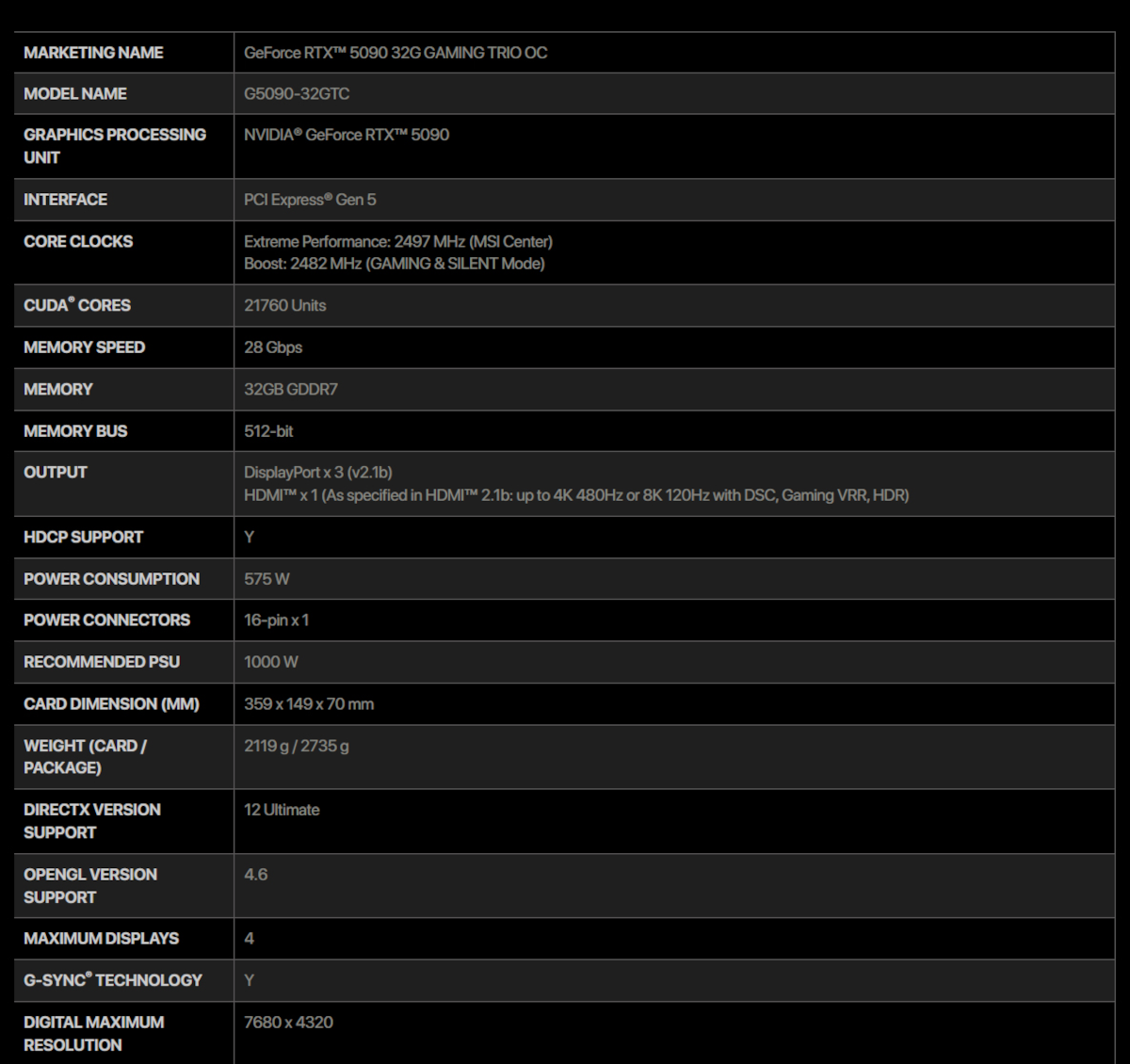 MSI GeForce RTX 5090 GAMING TRIO OC Graphics Video Card 32GB GDDR7 RGB LED
