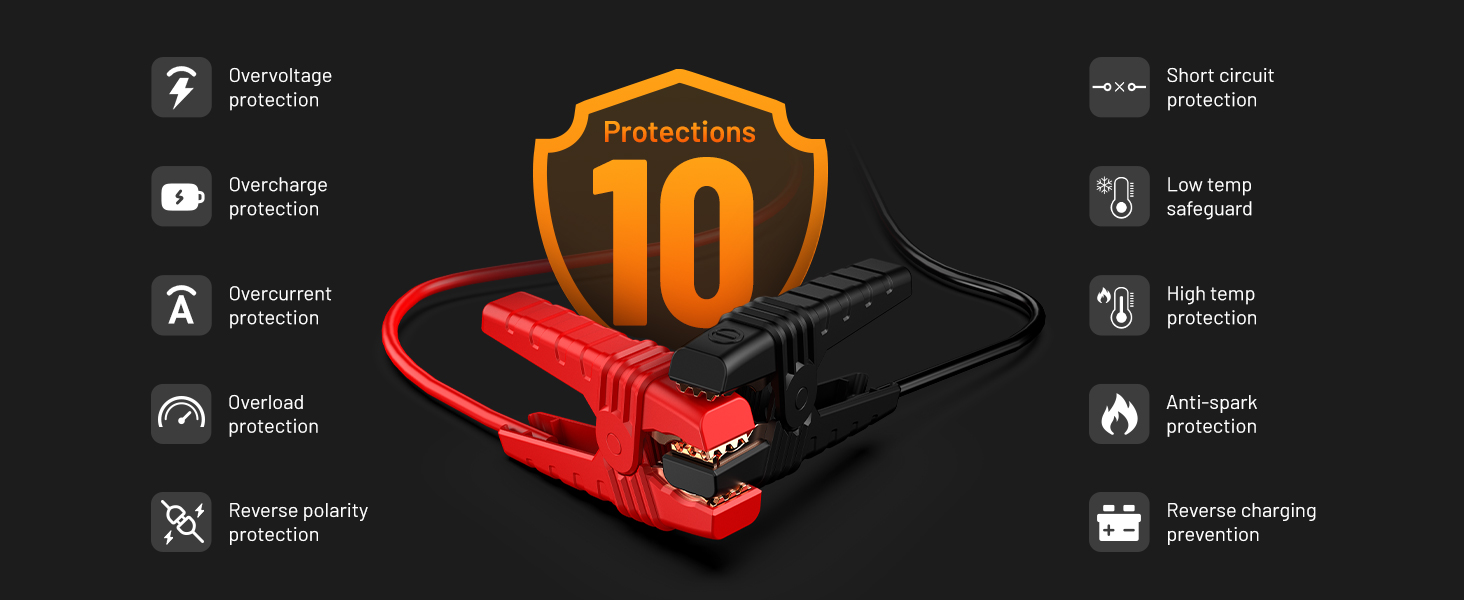 Multiple Protections Chip --Mit 10 integrierten Sicherheitstechnologien (Überladung, Überstrom, Kurzschluss, Verpolung, Niedrigtemperatur, Hochtemperatur, Überspannung, Überlast, Funkenfrei, Rückladung). Automatische Erkennung, Echtzeit-Alarme, 100% sicher, keine Funken.
