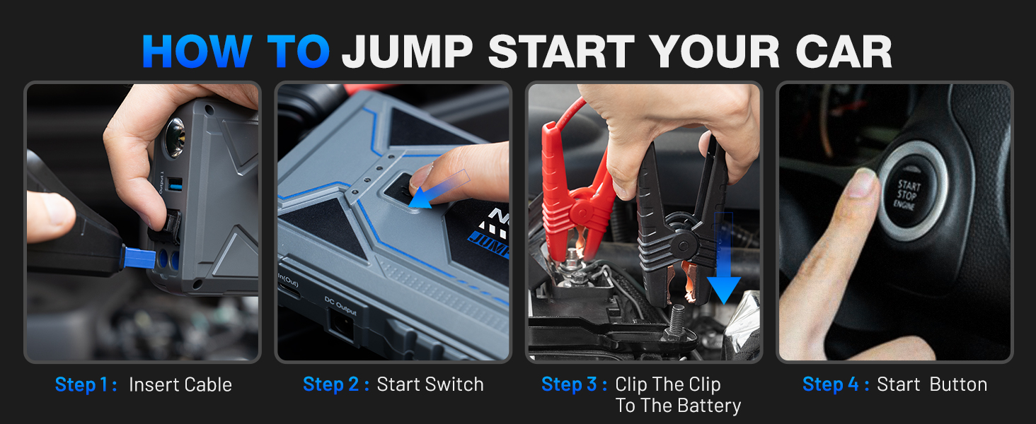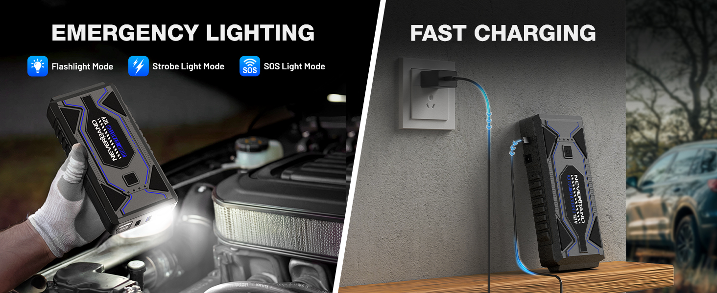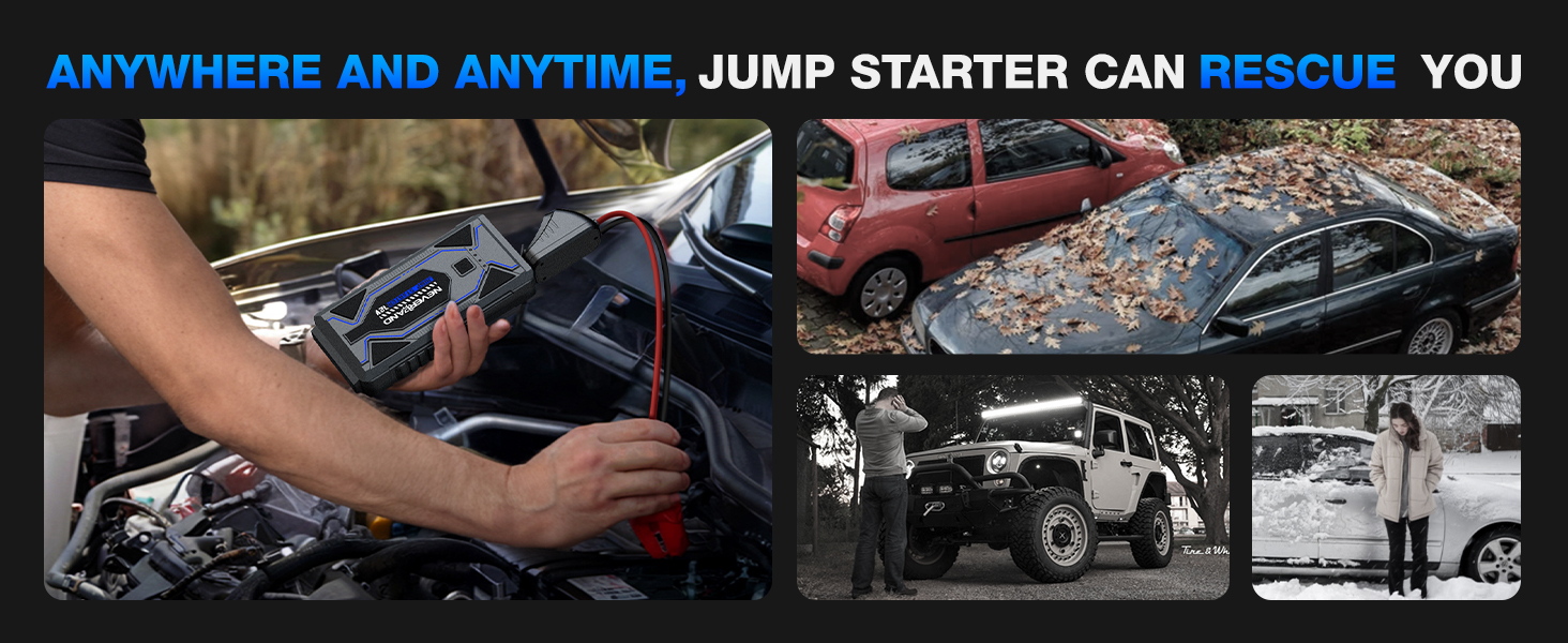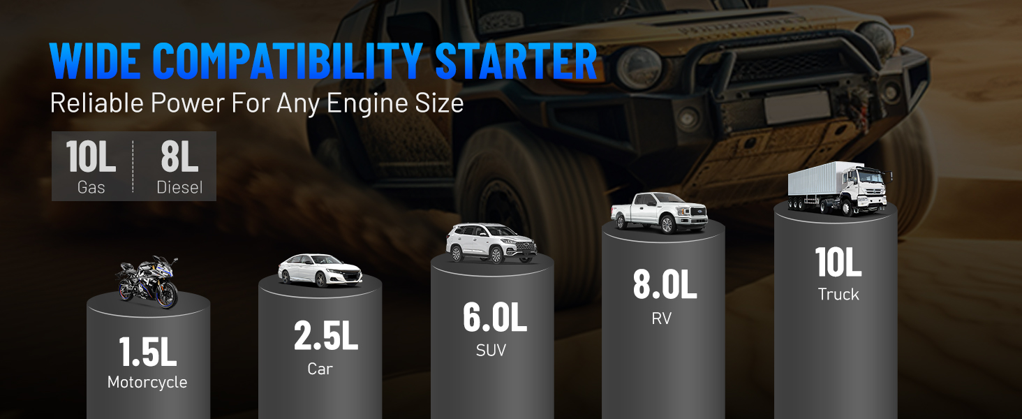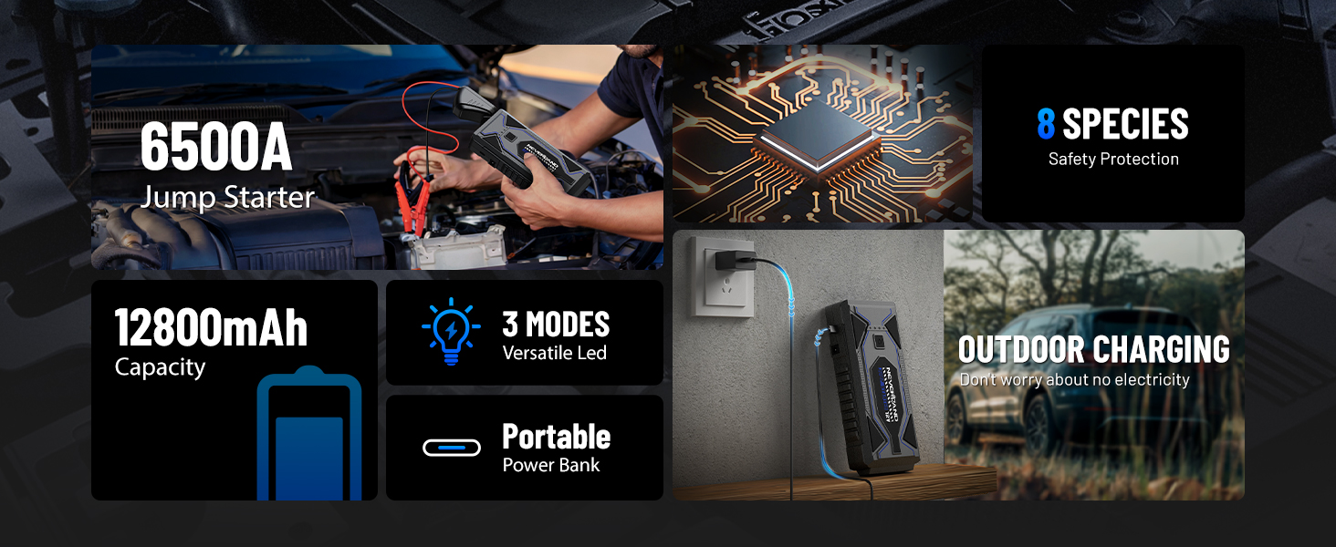 Strong Start --Auto-Starthilfe liefert bis zu 6500A Spitzenstrom, kann alle 12V Autos starten (inkl. Hybrid), wie Motorräder, ATVs, UTVs, Rasenmäher, Schneemobile, LKWs, Boote, Wohnmobile, Traktoren usw. in wenigen Minuten (für bis zu 8.5L Benzin oder 6.5L Diesel).