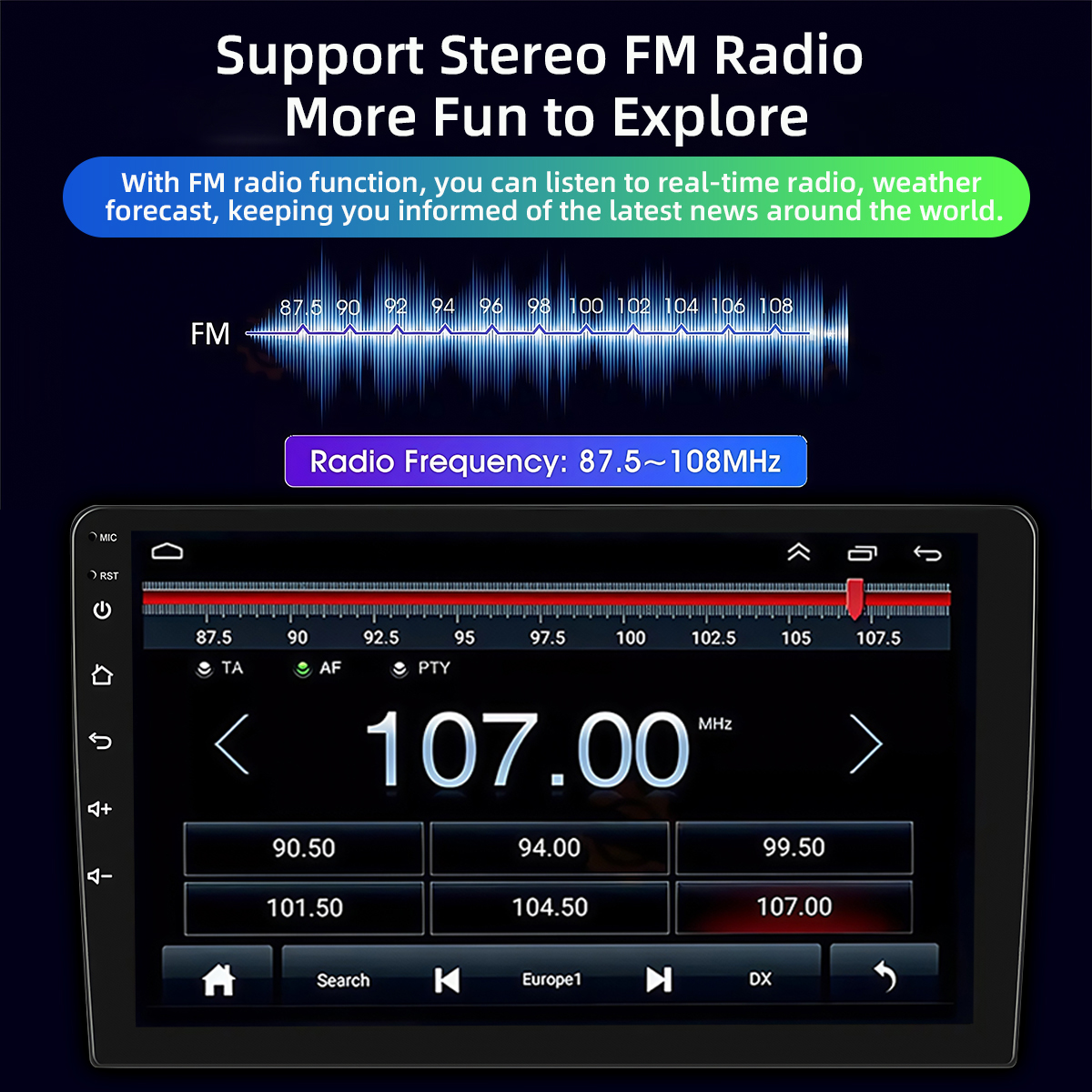 ●FM Radio: Online music you can transfer the music to the car stereo by FM to enjoy the original car stereo sound,with 18 preset stations