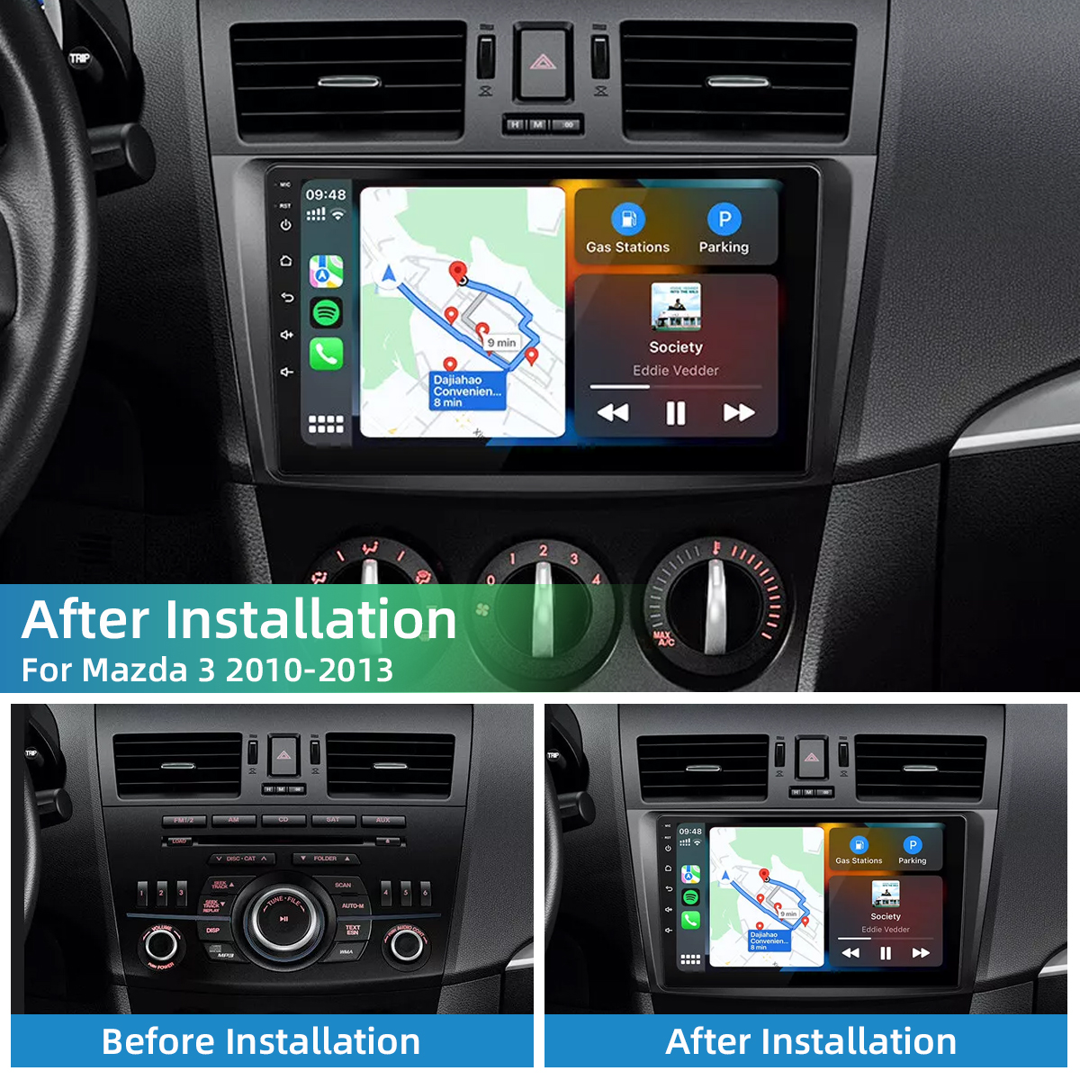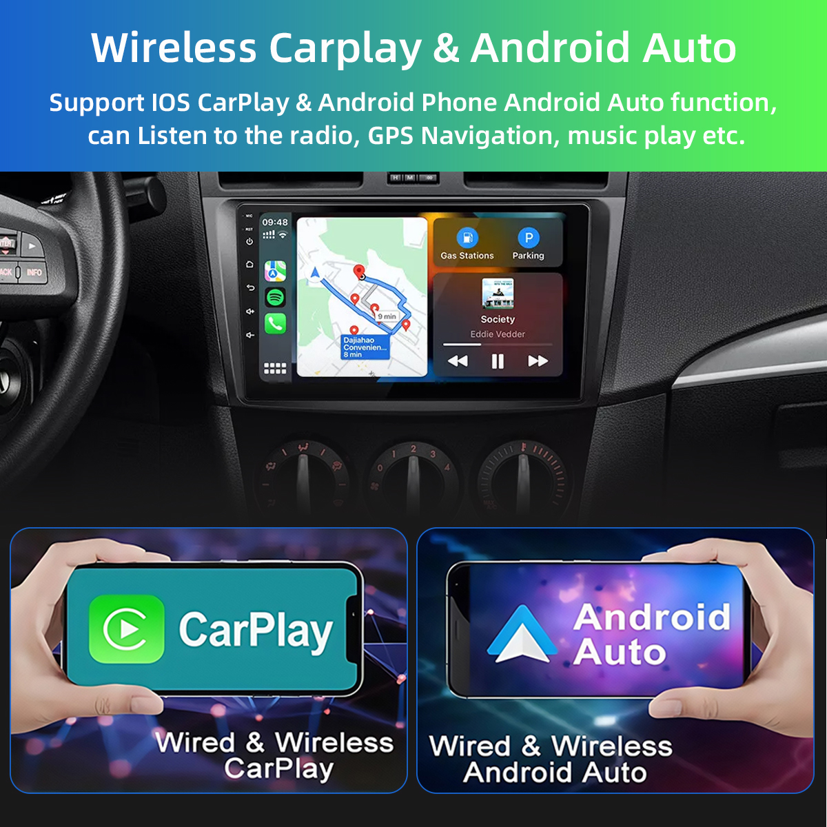 ●Wireless & Wired Carplay: wired or wireless Carplay in-vehicle system can closely integrate the user's iOS device and iOS experience with the dashboard system. Users who use wireless Carplay can connect to the car system via bluetooth to realize voice-controlled navigation, make calls, send and receive messages, and listen to music. It is only available for iPhone .