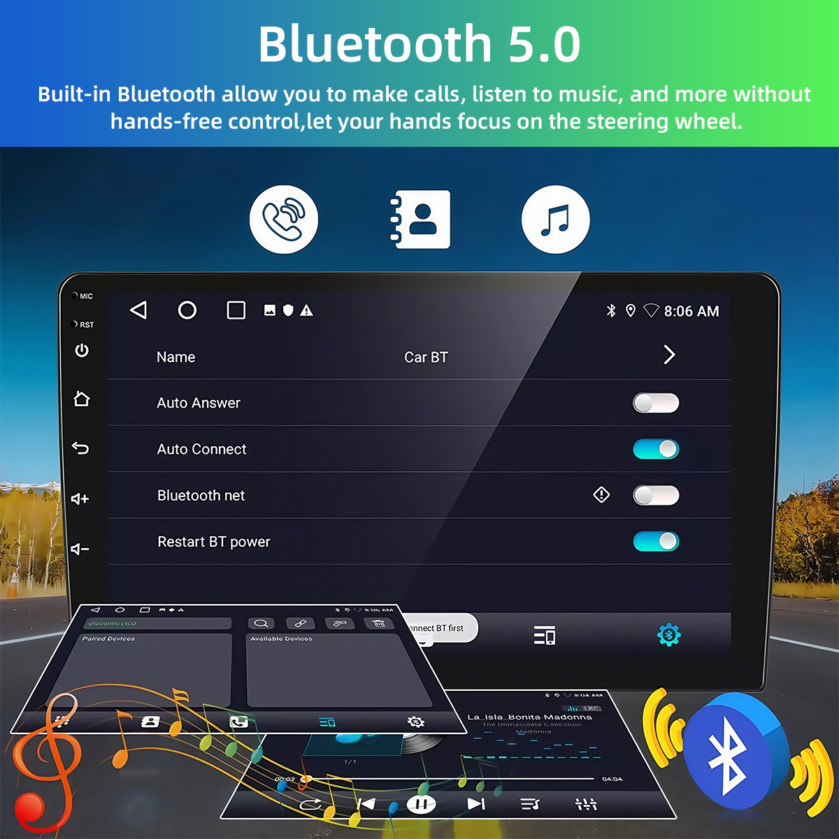 ●Built-in bluetooth with A2DP/Hands Free/Phone book:bluetooth hands-free calls,Bluetooth music player,Auto loading phonebooks