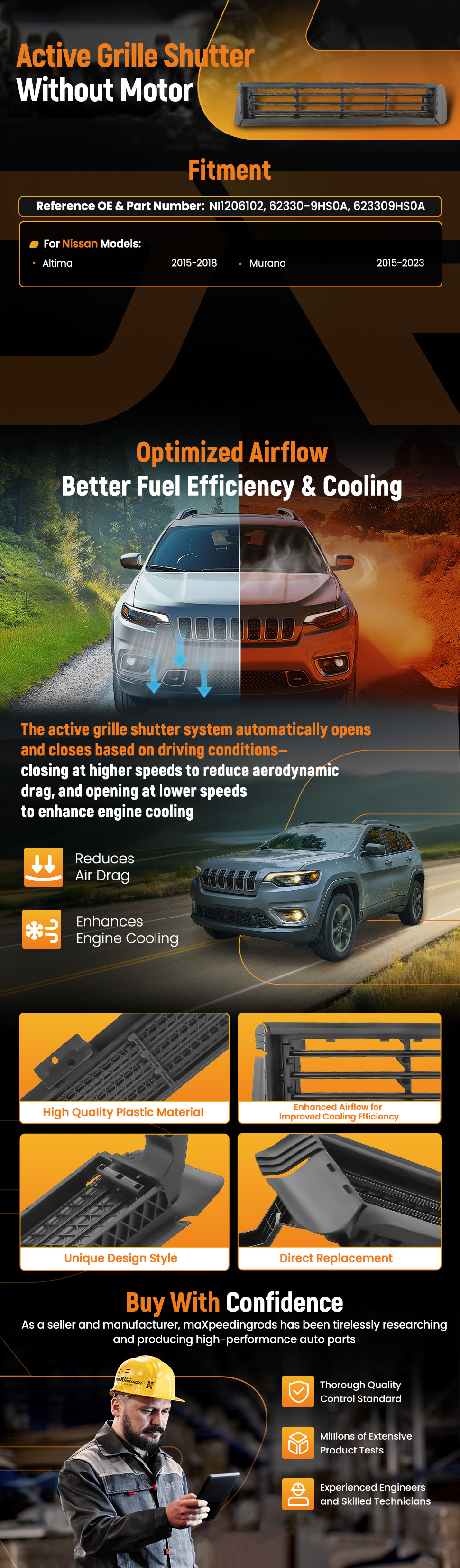 The front active grille shutter is manufactured to exacting standards, meeting or exceeding OE quality to deliver high performance and good durability.