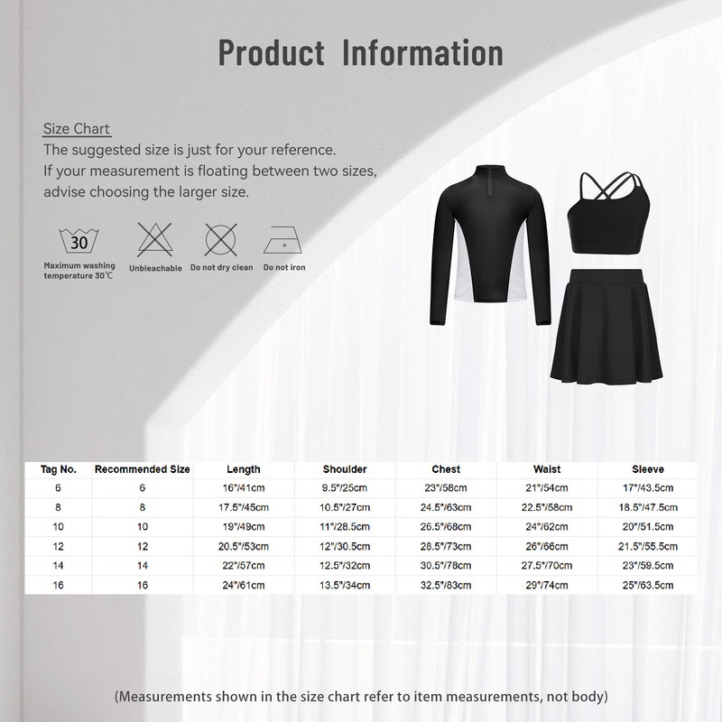 | Tag No. | Recommended Size | T-shirt Length | T-shirt Chest | T-shirt Sleeve | Vest Length | Vest Chest | Skirt Length | Skirt Waist |
