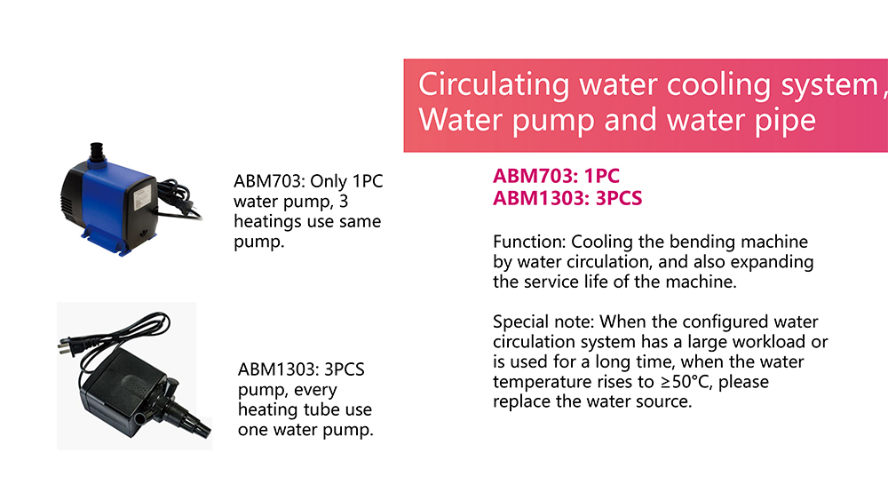 The standard configuration for each item is: water pump *1, water tube *3. Pls prepare the bucket or other container by yourself for water. Full with the water, connect the machine and water pump by water tube. Put the pump into bucket and switch on to fill with the water of water tube. After long time working, the water temperature goes up. To achieve better cooling effect, pls change the water in bucket which up to 50℃。