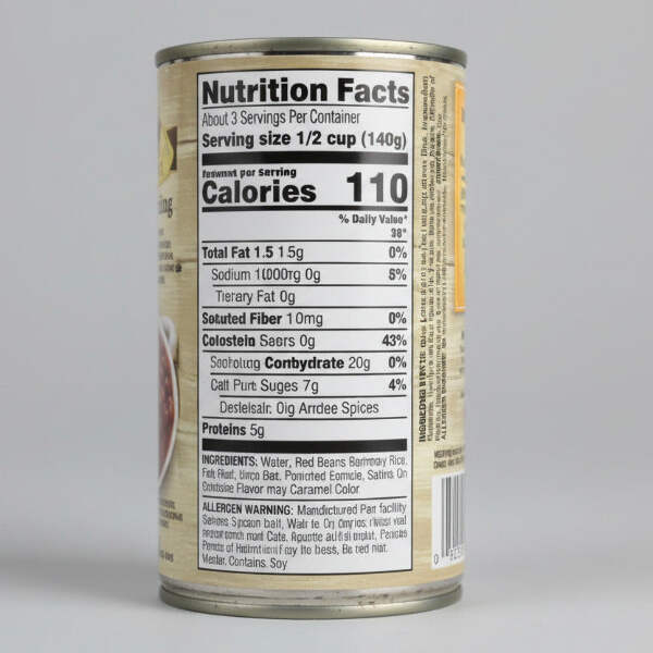 Ingredients: Water, Prepared Red Beans, Long Grain Enriched Rice, Monosodium Glutamate, Hydrolyzed Soy Protein, Salt, Soybean Oil, Corn Flour, Dehydrated Onion, Spices, Extractive of Paprika, Rendered Bacon Fat, Natural Hickory Smoke Flavor, and Caramel Color.