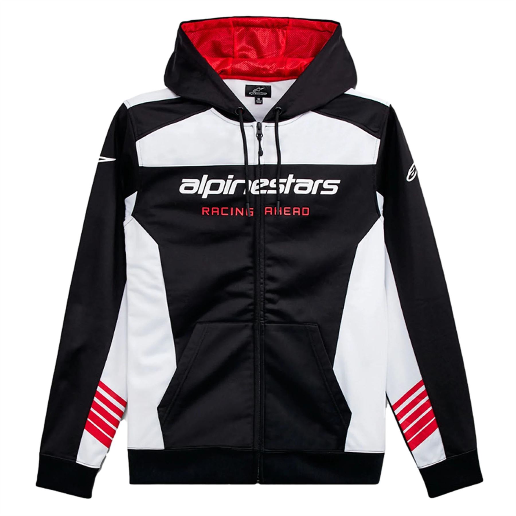 Alpinestars Hooded zip front poly fleece.100% polyester, 240 gsm.Zip front body with contrast panels.Mesh lined hood, tech drawcords, rib cuffs and hem.Chest HD word logo, sleeve logos and graphics.Internal main label and external label branding.