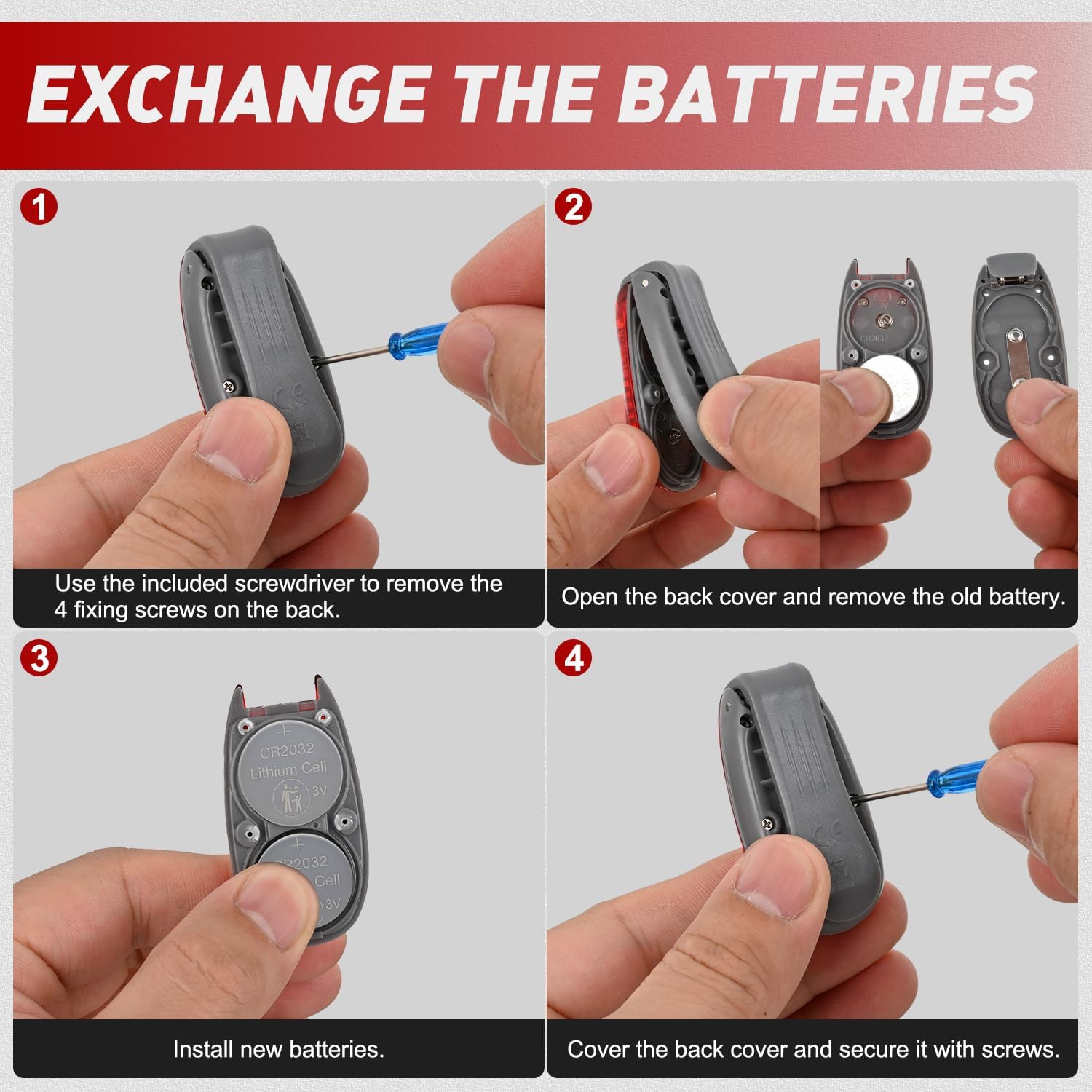 Long Lifespan: Each light is equipped with 2pcs CR2032 batteries, which are durable and have a long service life. To replace the battery, use the included screwdriver to remove the back cover, replace the battery with a new one, and then reinstall the back cover