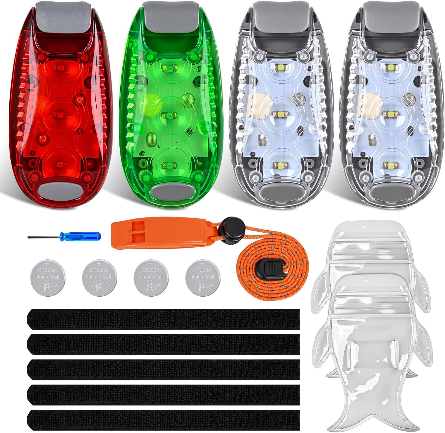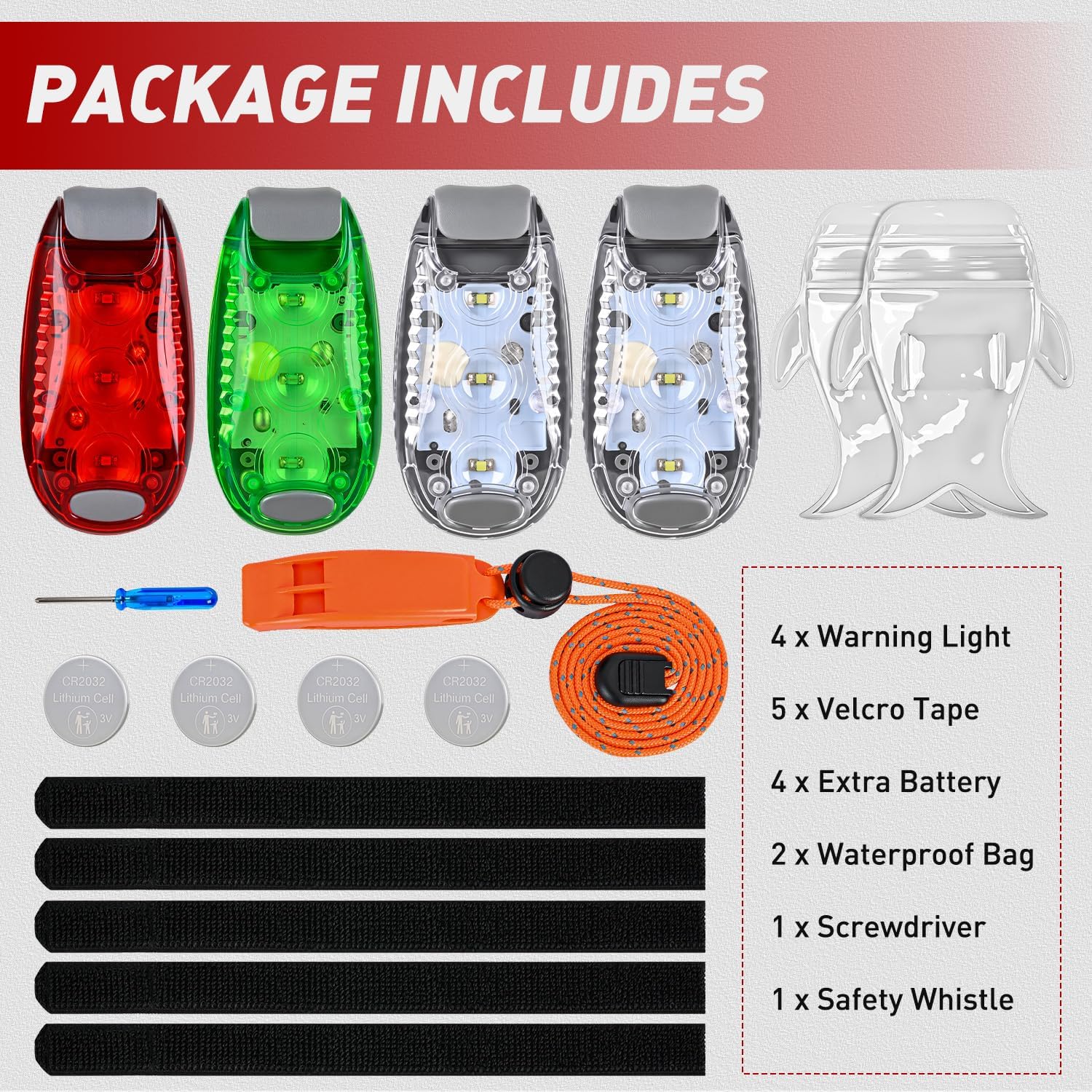 Package Included: 4 x Warning Light, 5 x Velcro Tape, 4 x Extra CR2032 Battery, 2 x Waterproof Bag, 1 x Screwdriver and 1 x Safety Whistle