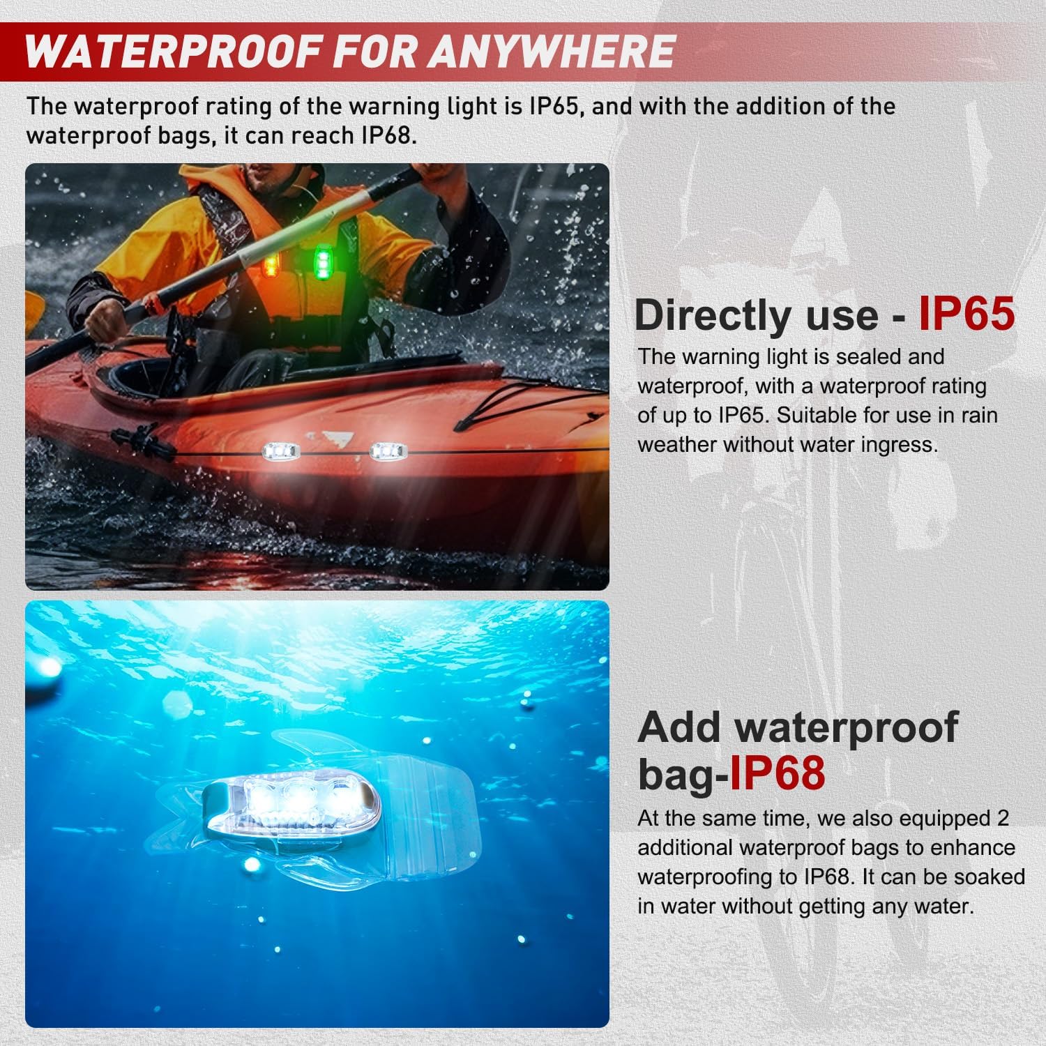 Improve Waterproof Level: The safety lights itself has IP65 waterproof grade, so there is no need to worry about water ingress and failure in rainstorm and other severe weather. At the same time, we also provide waterproof bags to make the lights waterproof to IP68, allowing it to be used in swimming and diving activities