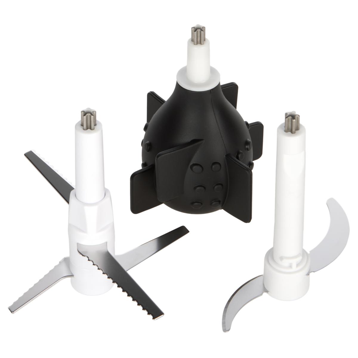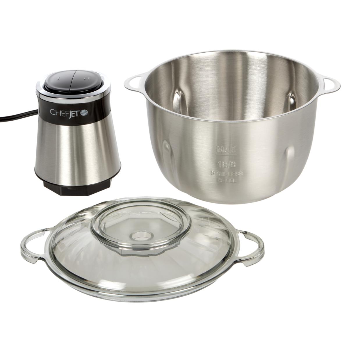 Chef Jet Tila put his mind to developing an electric chopper, and he went all out. He chose a heavy gauge stainless steel bowl—not plastic, which can crack and fade over time. Or a glass bowl, which is hygienic, but it can shatter. And for chopping and crushing, he developed attachments with durable stainless-steel blades: a four-blade accessory that's fine-edged for chopping meats, nuts, veggies and fruits. And a three-blade heavier-gauge accessory that's serrated, made specifically for crushing ice. You'll also get a unique, rubberized knobby attachment, specifically designed to peel the skin from garlic cloves. The unit's removable motor sits on top of plastic lid, which serves double duty as a storage lid. He even includes a silicone stabilizer ring to help prevent the chopper from sliding around your countertop. The bowl, bowl lid and blades are all dishwasher safe. ETL listed.