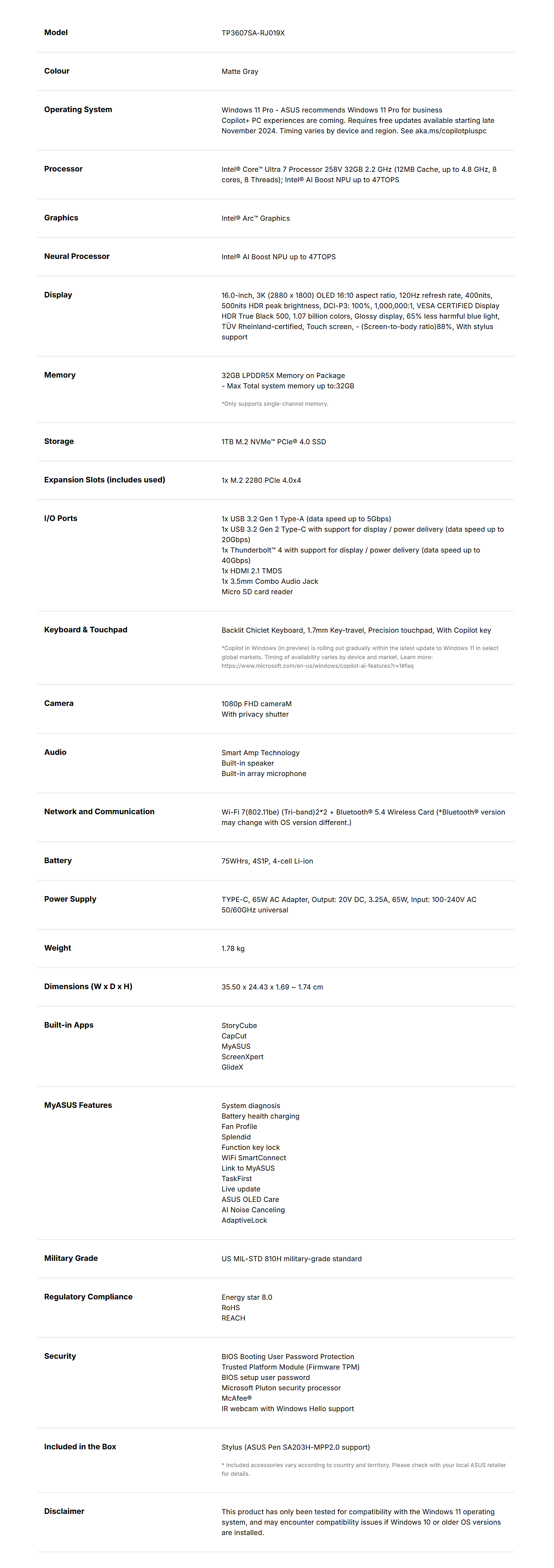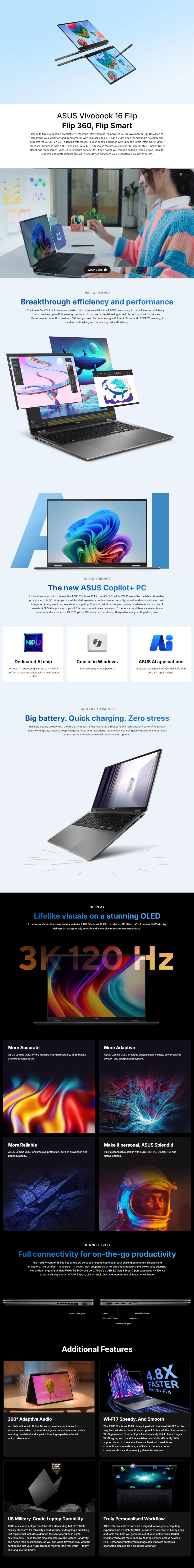 Asus Vivobook Flip 16" Laptop Ultra 7 258V 2.8K OLED 120Hz TS 32GB 1TB SSD W11P