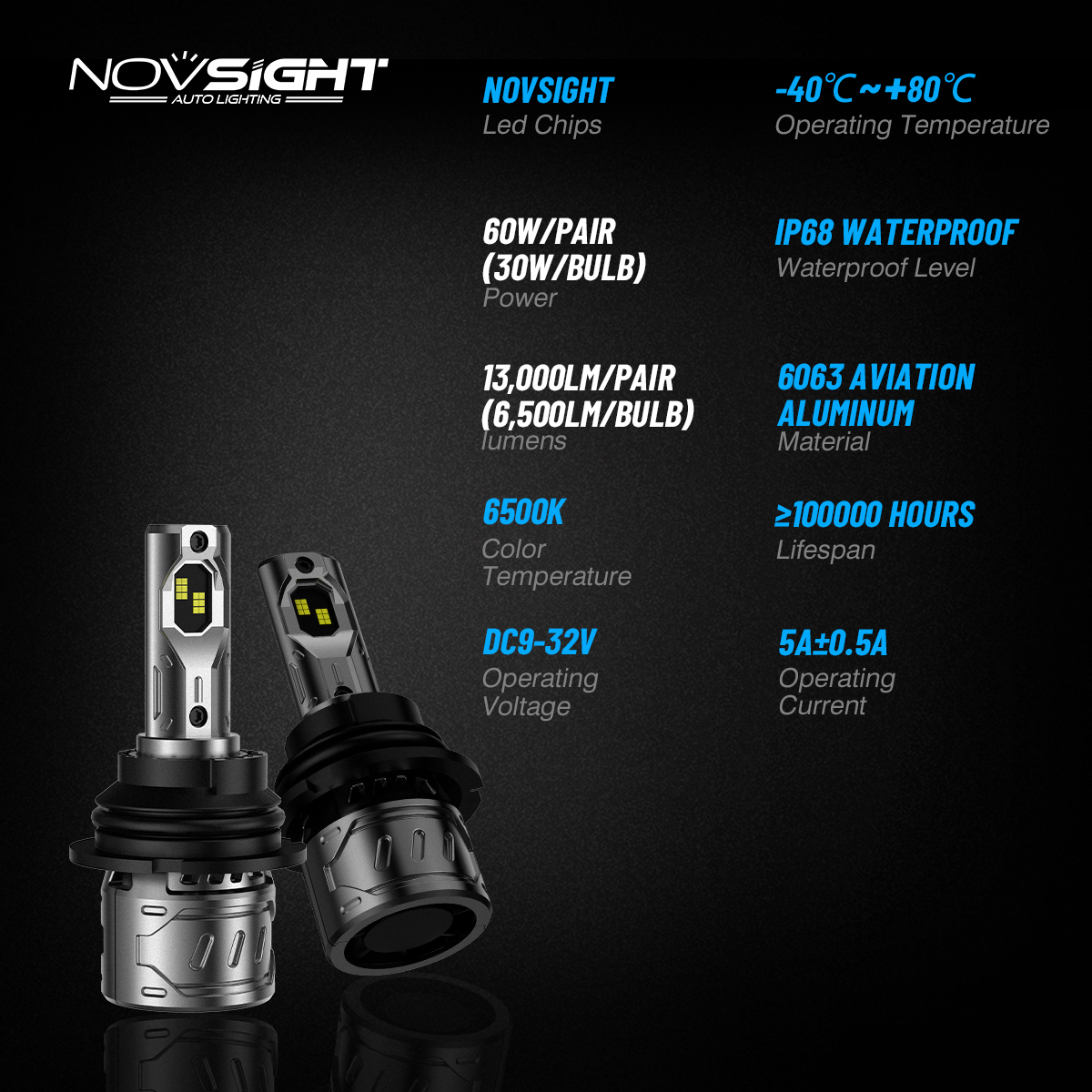 【Durable, Extended Lifespan Of 100,000 Hours】NOVSIGHT 9004 led headlight bulbs built-in mute turbofan and the aviation aluminum material for best cooling, ensure the led headlights work steadily and continuously which leads to a longer service life than the halogens, no more frequent changes.
