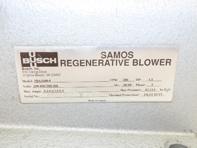 FBA3206-6 Ring Compressor Samos Regenerative Blower 206cfm 4.5Hp 480VAC 2"NPT Busch