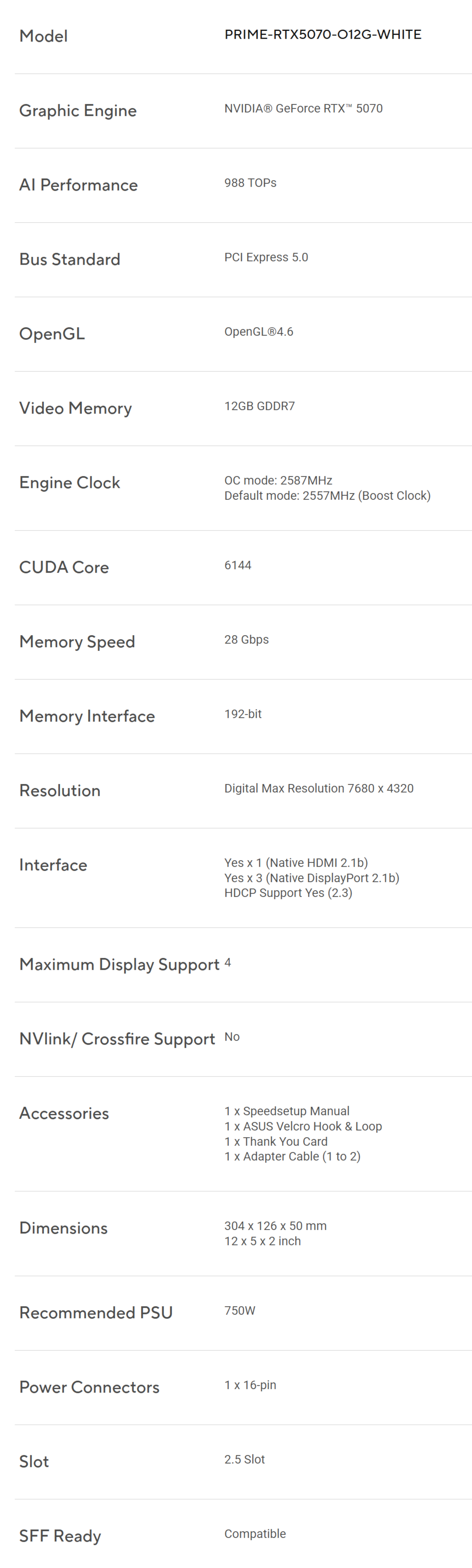 ASUS PRIME GeForce RTX 5070 12GB GDDR7 OC Gaming Graphics Video Card White HDMI