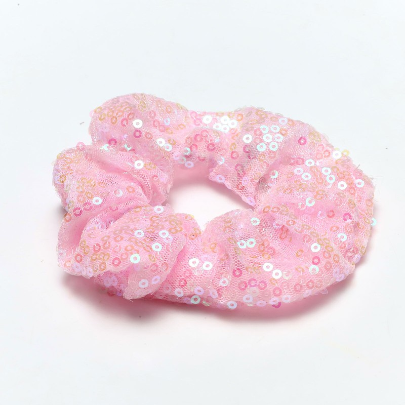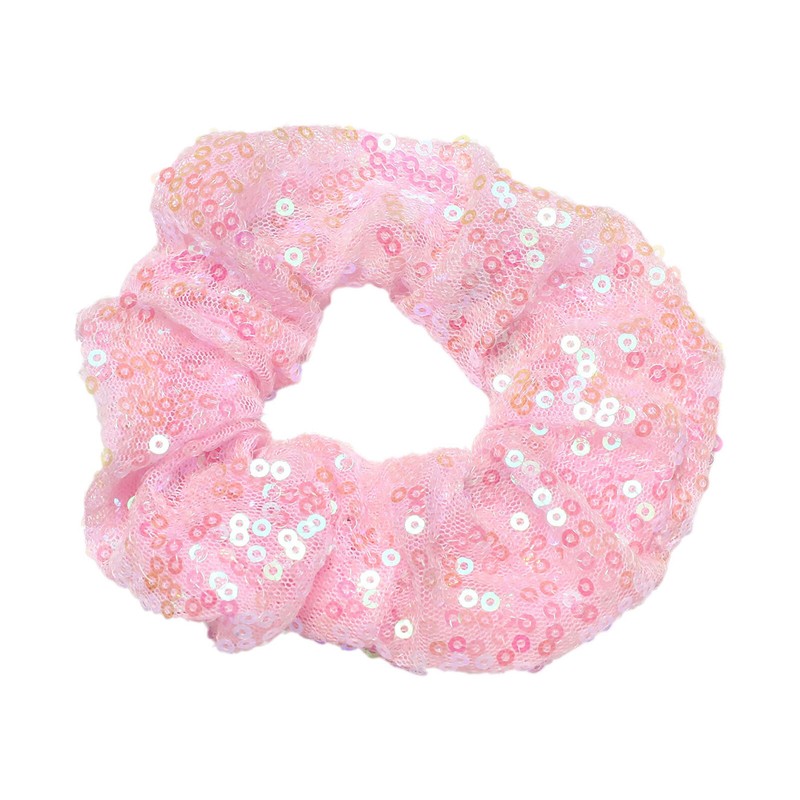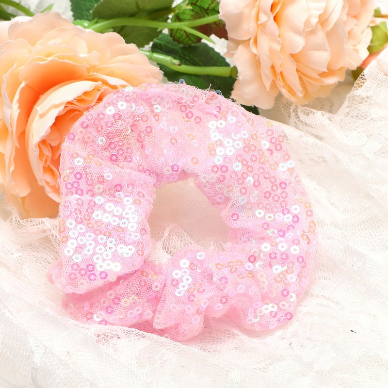 Wide and ruffled scrunchie with shiny sequins, is 12-22cm/4.7-8.7 inch in circumference.