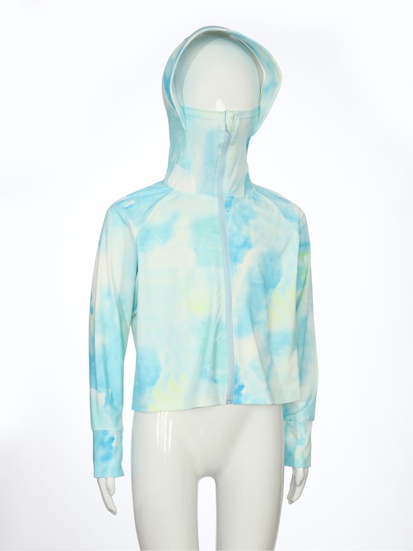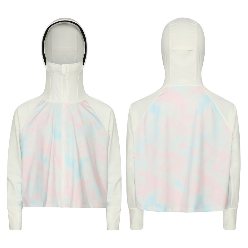 The long-sleeve, high-neck and hooded design with a wide-brim hood provides excellent sun protection in outdoor settings. Zipper closure for easy wearing.