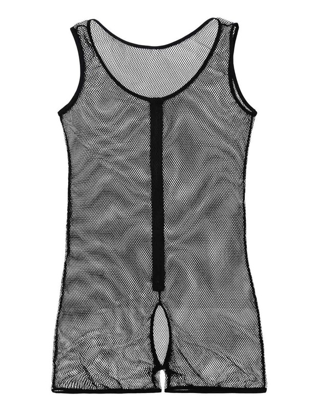 Men’s thong, strap waistband, T-back style, with mesh and lace flower design.