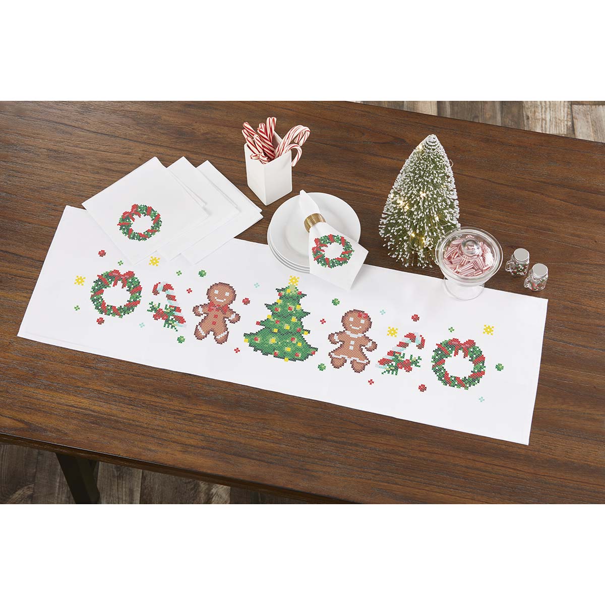 Save when you buy both! This Christmas set with a coordinating table runner and napkins is decorated with classic holiday motifs with a merry display of gingerbread people, candy canes, and Christmas wreaths along with a brightly lit Christmas tree. These cross-stitch designs are stamped for stitching on white cotton/polyester fabric with a hemmed edge. This set includes one 14 x 44" (36 x 112cm) table runner and four 16 x 16" (41 x 41cm) napkins, allowing you to create a coordinated look on your kitchen table. The table runner and napkins are pre-finished and ready for stitching. Simply follow the easy-to-read chart and instructions to stitch the designs. Floss and needle are not included. Made in U.S.A. • These pre-finished table runner and napkins are ready for stitching with gingerbread men and women, candy canes, Christmas wreaths, and a Christmas tree. • The table linens are stamped for cross-stitch on white cotton/polyester fabric with a hemmed edge. • Set includes table runner, napkins, and instructions. Floss and needle not included. • Set contains one table runner and four napkins. • Table runner measures 14 x 44" (36 x 112cm). Napkins measure 16 x 16" (41 x 41cm) each.