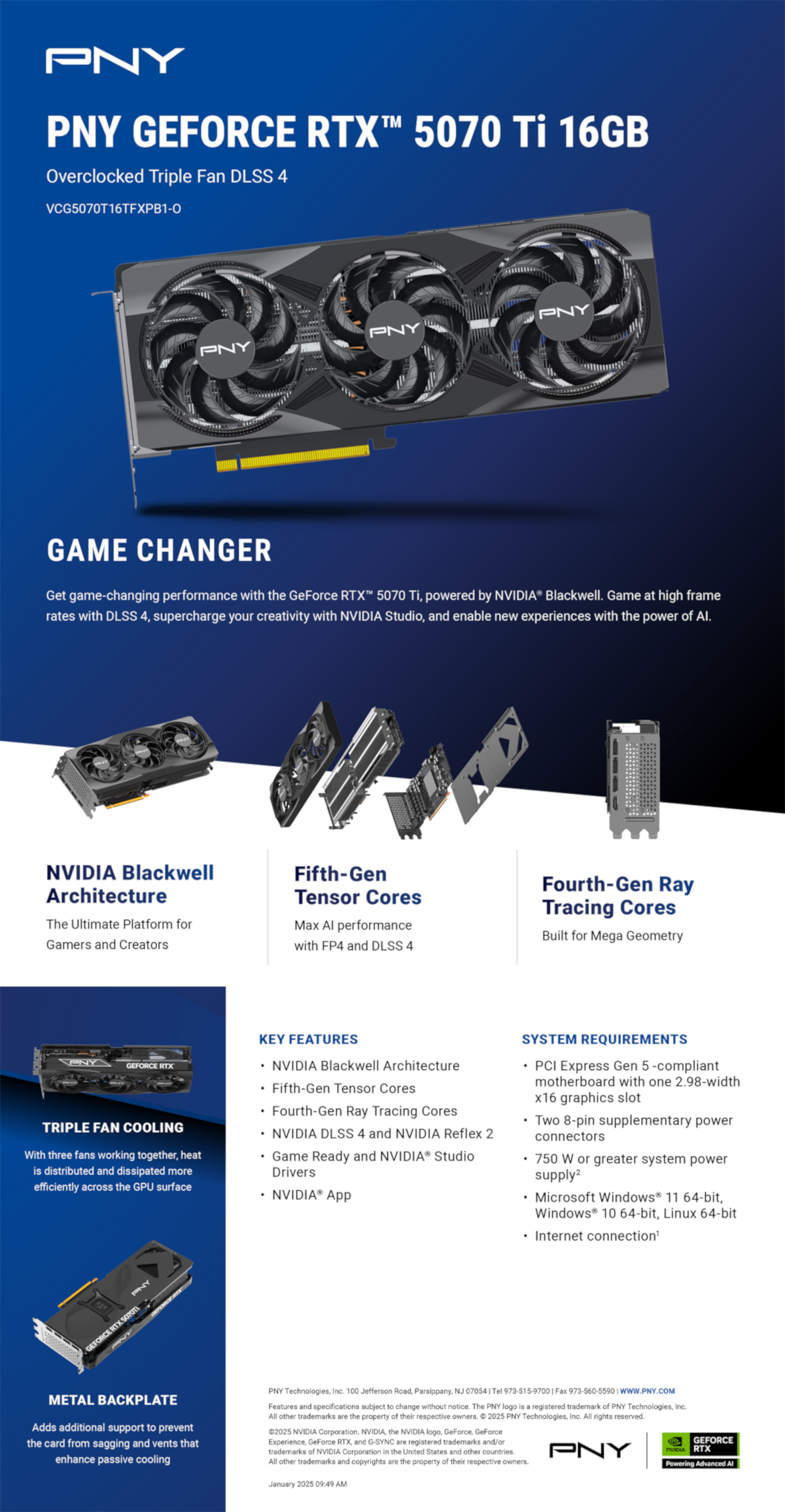 PNY GeForce RTX 5070 Ti 16GB DLSS 4 28Gbps GDDR7 Triple Fan Graphics Card