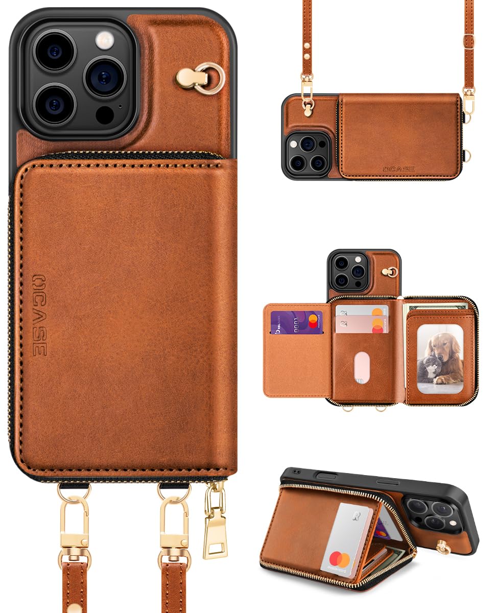 Hülle für iPhone 16 Pro Handyhülle, RFID-Blockierung PU-Leder Reißverschluss Handtasche Geldbörse Flip Cover, Kickstand Folio Case mit Kartenschlitzen Halter Handgelenkband Lanyard Braun