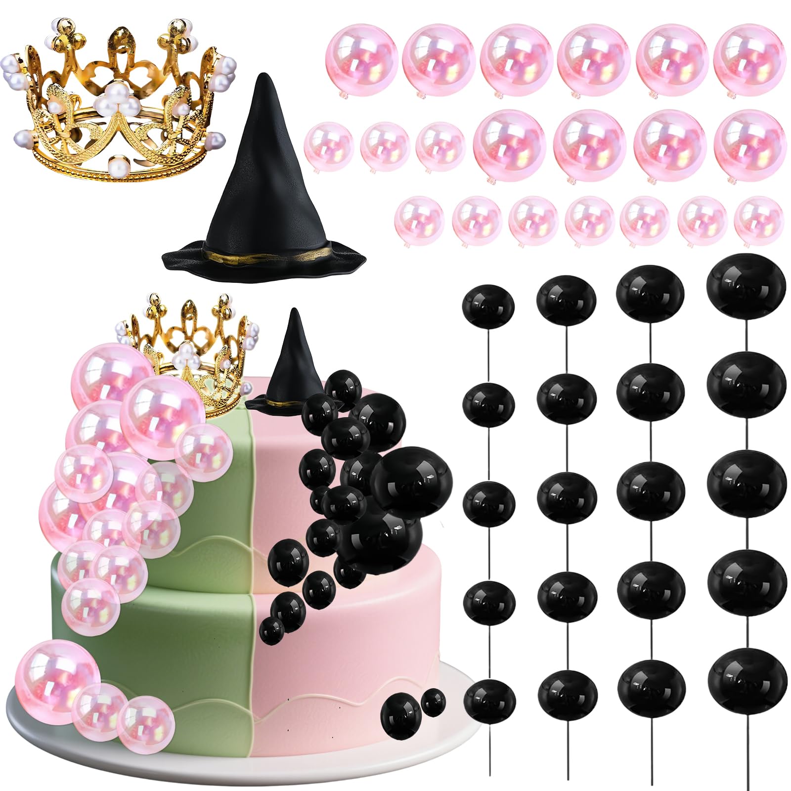 42 Pcs Wicked Cake Decorations Kit:Four Sizes Of Black Decorative Balls, 5 Each, 20 Total, Large Pink Clear Decorative Balls, 10 Total, Small Pink Clear Decorative Balls, 10 Total. One Witch'S Hat, One Crown