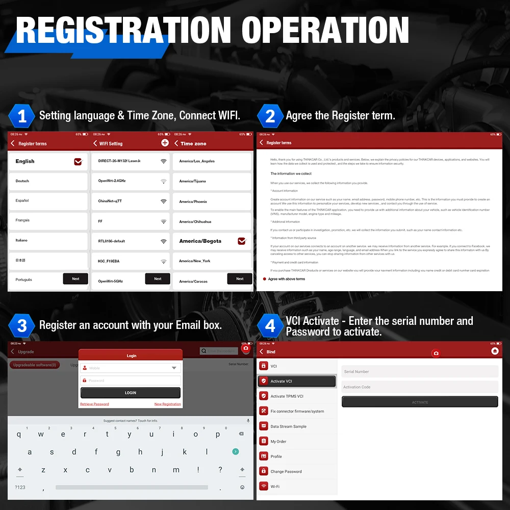 Bi-directional test / Activate test Request information or command a module to perform specific tests and functions. For instance, in the case of OBD II generic information Mode 1, you can initiate a request for information from the powertrain control module, and the PCM responds by sending the information back to the scan tool for display. In addition, thinktool scanner have the ability to actuate relays, injectors, coils, or perform system tests, etc. ![]() E~CU Coding Gives More Control of Your Cars Car E~CU coding is a process to code your vehicle modules and modify codes to activate many functions. It is widely applied to modern automotive repair to solve the increasing module replacement, retrofitting, calibration, personalization, etc. Many believe that only manufacturer and authorized garages are accessible. However, all you need is a LAUNCH X431 PRO5 diagnostic scan tool to do it yourself. E~CU Coding E~CU Online Coding/Online Calibration/Online Matching: Thanks to abundant online vehicle database, the LAUNCH X431 scanner could get more OEM codes for high-end vehicles including Benz (SCN coding), BMW, VW, Skoda, Seat, etc. deactivate the auto start-stop / deactivate injector buzz sounds / disable seat belt warning sounds / customize the color of interior lights / change US-style daytime running lights / automatic mirror folding and unfolding / activate the “needle sweep” function when the ignition is on / set how many times its one-touch signal flickers with one touch / and More. Retrofitting: This function means installing or changing some modules to upgrade a vehicle's performance such as Installing Fog Lights, Retrofitting Headlamps, Installing HID Inside A Halogen Headlight, etc. Personalization/Flash Hidden Functions: Maximizing the vehicle owners’ preferences and customizing the vehicle’s pre-programmed settings as needed. This OTOFIX scan tool won’t change the software and only help to activate high-end functions or disable some unneeded functions for Au-di, VW, Skoda models. Such as deactivating the auto start/stop, mirrors automatic folding and unfolding, activating daytime running lights, etc. NOTE: ECU Coding is NOT universally compatible with all vehicles, and varies by make, model, and year. Please confirm with us before purchasing. ![]() Full System Diagnosis Thinktool car scanner to diagnose car comprehensively, Thinkcar Thinktool car code reader can read DTCs and data streams, perform active test, Coding for ALL systems. For instance: Engines/Transmission/Airbags/Immobilizer/Key Coding/ABS/Cruise Control/Instruments/ Self Leveling Suspension systems/Seats/Doors/Gateway/Steering Angle/Air Suspension/Body Systems/Electronic Power Steering & Motor Assisted/Power Steering/Tyre Pressure/Rain Sensors/ 4WD System/Stabilizer/Intelligent Parking Assist/Door Motors/Audio Systems/Air Conditioning/Tiptronic/Anti Theft/Soft Top/Headlamp Leveling/Central Locking/Automatic Clutch/ DPF Reset/Electric Windows/Plip coding/Heated Rear Window/Xenon Headlights/Wash Wipe/Fuel Burning Heater/Transfer Box/Seat Memory/Oil Life Service Reset/Sliding Doors/Electronic Throttle/Navigation System/Rollover Sensor/Cruise Control/ Multi Function Steering Wheel/Aux Heating/Electronic Parking Brake/Clutch Electronics,etc.. ![]() ![]() 34+ Special Functions Thinktool code reader & scan tool can program and code the electronic control system of prevailing vehicle models, also perform special functions, including Oil Reset Service, Steering Angle Calibration, Electronic Parking Brake Reset, Battery Register / Battery Maintenance, ABS Bleeding, Electronic Throttle Position Reset / Learn, Diesel Particulate Filter (DPF) Regeneration, Tire Pressure Monitor System Reset, Gear Learning, Immo, Fuel Injector Coding, Air Suspension Reset, Gearbox Reset, Sunroof RESET, AFS Reset (Adaptive Front lighting System), EGR Reset, ect. Wide Vehicle Coverage ,150+ Car Brands Europe vehicle ,after 2001 and newer : Compatible with Vaz, Porsche, Maserati, BMW, Seat, VW, Audi, Citroen, Landrover, Smart, Renault, Skoda, Sprinter, Land Rover, Benz, Fiat, Opel, Volvo, Peugeot, Ferrari, Saab, Gaz, DR USA vehicles , after 1996 and newer : Compatible with Gm, USAFord, Chrysler, Dodge ; Willy; Australia: Compatible with Austford, Holden; Brazil: Compatible with BXFiat, BXGM Aisa vehicles , after 2003 and newer : Compatible with Changcheng, Daewoo, Huachen, Zhongxing, Indian Tata, JAC, Maruti, Perodua, Chery, Isuzu, Jinlong, Suzuki, Saipa, HM, Hmazda, Ikco, Malaysia Proton, Luxgen, Toyota, Changan, Futian, Honda, Wuling, V-class, Jpisuzu, Kia, Indian Maruti, Indian Mahindra, Malaysia Perodua, Hafei, Lifan, Mahindra, Nissan, Xiali, Zhongshun, Tata, Changhe, China GM, Saicmg, Mazda, Zhongtai, Daihatsu, BYD Flyer, Hyundai, Proton, Subaru, Ssangyong, Joylong, Mitsubishi,Gonow, Qoros, Maxus, Mvm ![]() Additional Features Browser:Built-in Wi-Fi module makes surfing on the internet freely; Settings:To configure your personalized through it; Search:Enables you to locate your target quickly and conveniently; Email:Allows you to send and receive email. External POP3 or IMAP email account for some common Web email service provider can be added; File Manager:You can manage the files or downloaded files stored in SD card efficiently; Other Additional Functions:Alarm, calendar and calculator etc. Applications:Other android based applications can be customized to install or uninstall. Diagnostic Feedback: When you encounter unsolvable problems or diagnostic software bugs during diagnosis,you can revert the most recent 20 test records to ANCEL Team.When we receive your feedback,we will analyze and troublshoot it in a timely manner,to improve the quality of our products and user experience.(please contact with us after leaving feedback,thank you) ![]() Quickly Print Diagnostic Report: Print the diagnostic report of your car at any time Two way print: 1.Transfer the diagnostic report to the computer via USB, and then print it How To Regi