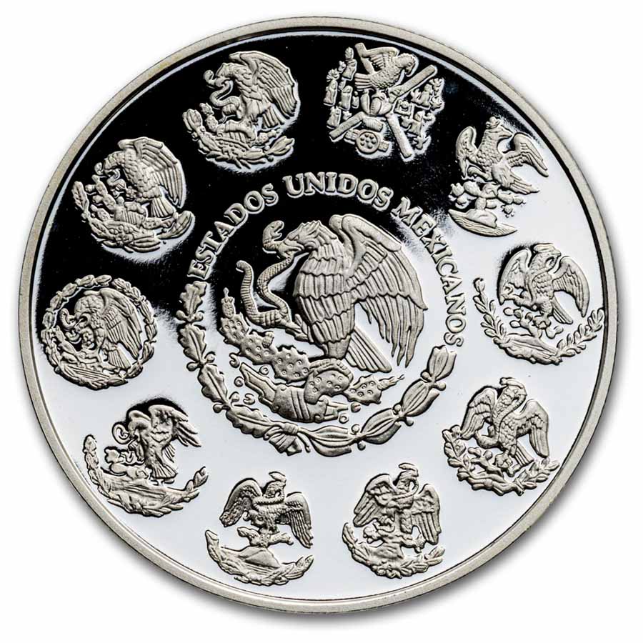 - Obverse 1 oz: Features a sculptural relief design of the national shield encompassed by the legend Estados Unidos Mexicanos (United Mexican States), surrounded by different national coats of arms used throughout Mexico's history.