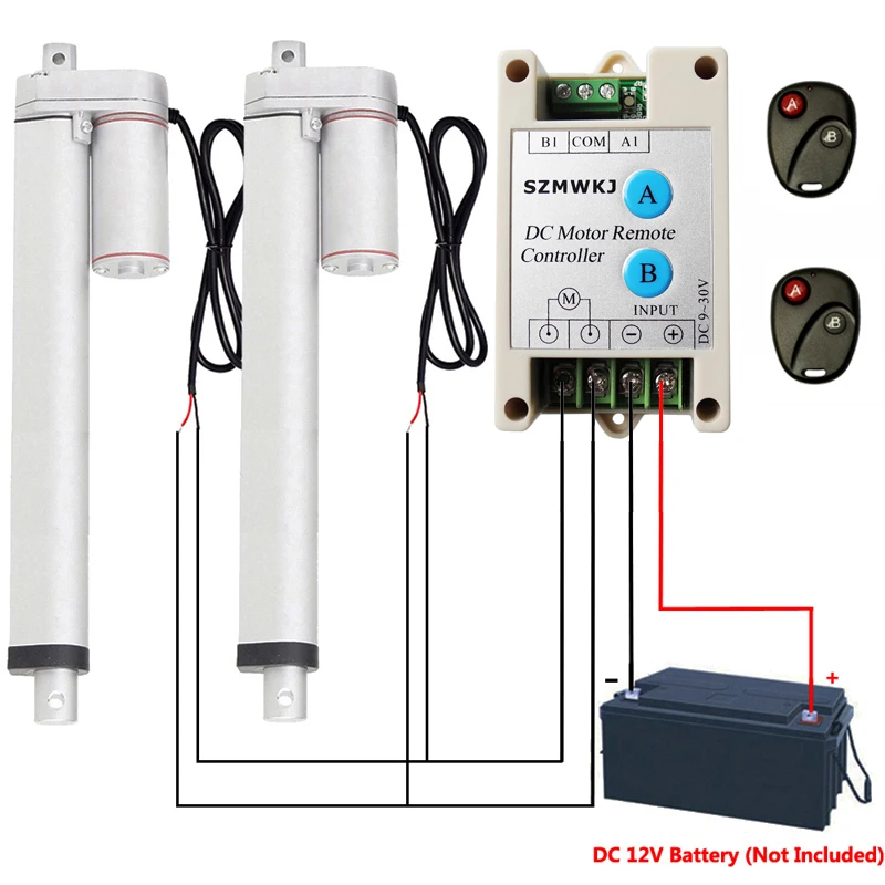 Product DescriptionLinear actuators are widely used in many industries, such as electric power, machinery, metallurgy, mine, petroleum, chemical industry, transportation, lifting, construction, food and feed processing and so on. With reliable performance, sensitive action stable running, the same characteristics of push and pull and good environment adapt- ability etc. 1500N Lift Electric 12V 2X14" 330lbs Linear Actuators Motor W/ Remote Controller Here for sale is 2PCS DC12V 350mm/14" Stroke 1500N/330lbs max push load 5.7mm/s speed Linear Actuators, It comes with 4PCS Mounting Brackets&1 Set of Wireless Remote Control Kits for easy installation and convenient operation. The wireless remote control kit can control the 2PCS linear actuators at the same time. The control kit comes with 2PCS remotes which are very small in size, convenient for operation. We have paired the 2PCS linear actuators and can guarantee 95% synchronization for them. ![]() ![]() Note 1: The battery in the photo is only for reference and is not included in the package. Note 2: Make sure the input voltage for the whole system is DC 12V and the input current is no less than 5A. Note 3: If there is no reaction after correct wiring, pls try to exchange the positive and negative pole of the power cord. ![]()