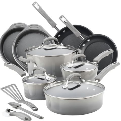From cooking tools and a pair of round cake pans to saucepans, skillets, and a large stockpot for one of Rach‚ Aos delish stoups, this versatile cookware set makes it easy to whip up your favorite dishes. The cookware and bakeware features the quality design and construction expected from Rachael Ray, for fast, efficient cooking when you want and need it most. Long-lasting nonstick on the cookware interiors and bakeware interiors and exteriors makes food release and cleaning up easy. Sturdy colorful enamel cookware provide a pop of kitchen personality, and match the grippy silicone handles on the pots and pans.