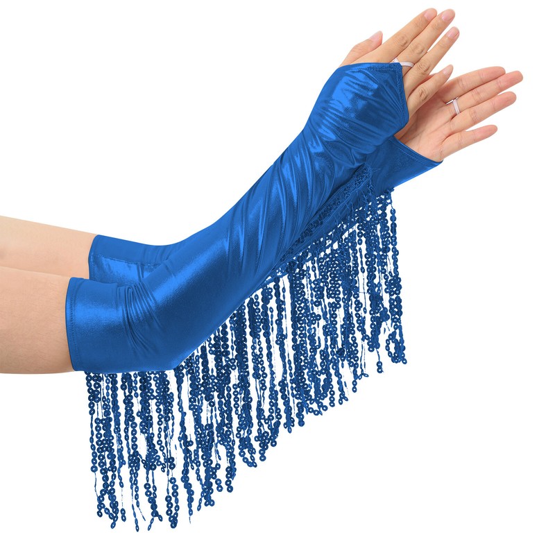 Metallic shiny gloves trim with sequin tassel, making you dazzling and eye-catching with each movement. The length is about 42.5cm/16.5 inch.