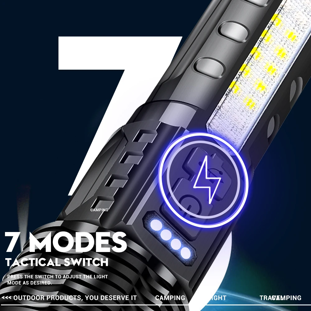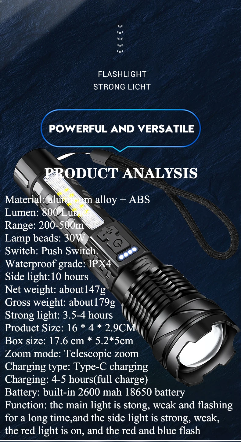 • Strong Light :Emits a powerful beam of light that can reach up to 500 meters, making it perfect for outdoor activities or emergency situations.