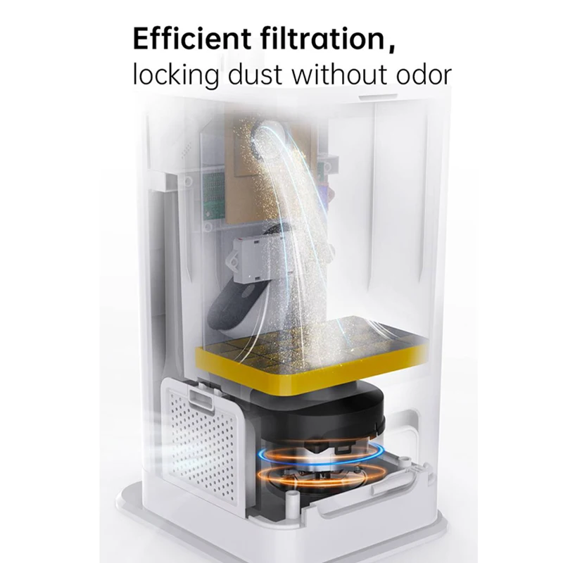 *No dirty hands, no contact with dirt, and easy-to-remove floor brushes: After cleaning, the vacuum cleaner returns to the base station, and the dust collection system automatically activates. Dust is transported through the device's internal filtration system to a disposable dust bag, eliminating the need for users to come into contact with debris. The floor brush components feature a convenient design for easy removal, allowing users to avoid direct contact with the brush head's hair and dirt-covered areas. The brush can be easily removed via the side structure, effectively preventing hand contamination.