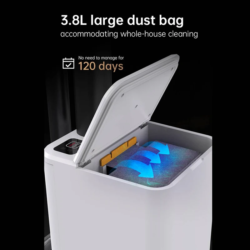 *120 days without emptying dust: Data from Dibe Laboratory, simulating real user environments, based on a sample of each household using the vacuum cleaner twice a week, resulting in a median usage time of 120 days. Actual results may vary depending on factors such as household size, home environment, and usage habits.
