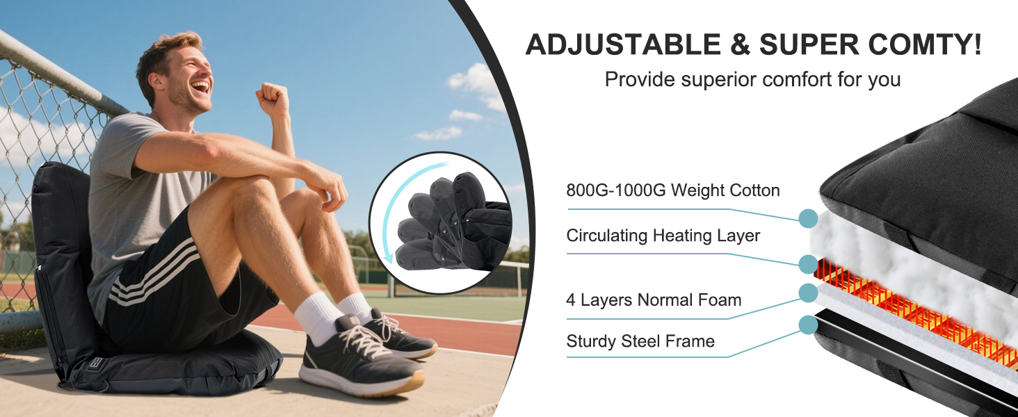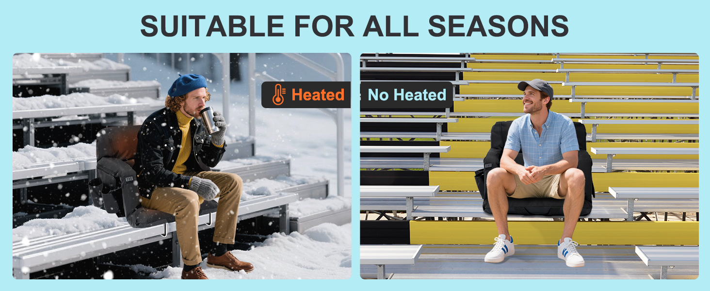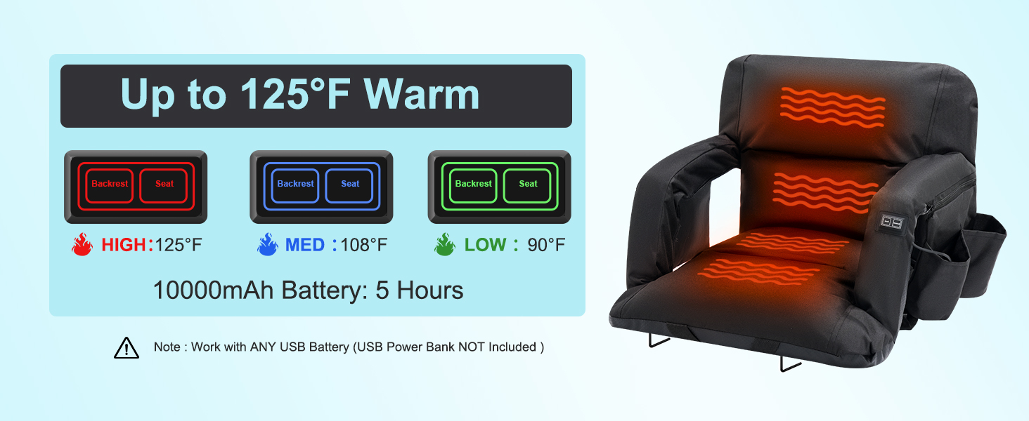 3-Level Heating Stadium Seats: Choose your ideal warmth: Easily select High (Red/≈125°F), Medium (Blue/≈108°F), or Low (Green/≈90°F) heating modes. Simply connect your own power bank (!! power bank not included) for adjustable comfort during any game or event