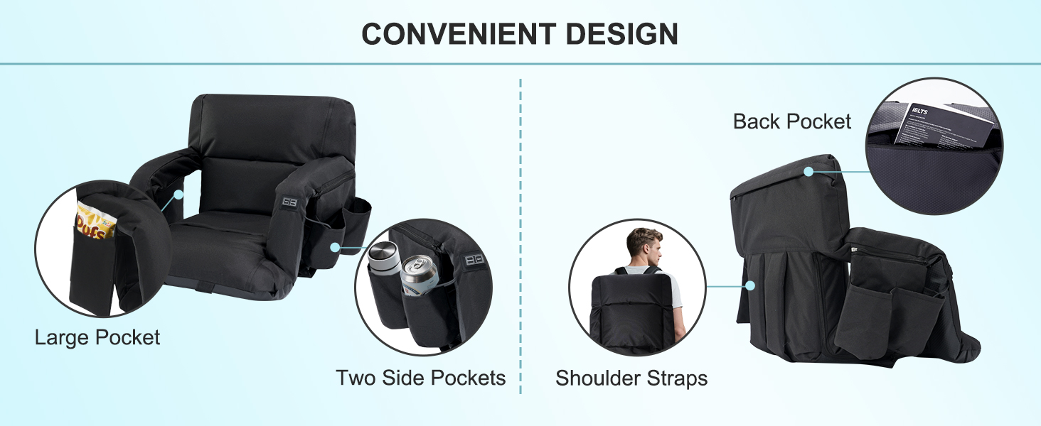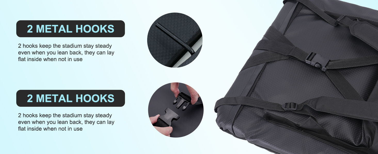 Secure and Stable Seating: The padded stadium seats with back support features two heavy-duty steel hooks and a reinforced anchor strap to firmly attach the seat to most bleachers or benches. Hooks conveniently store in a dedicated zippered pocket when not in use