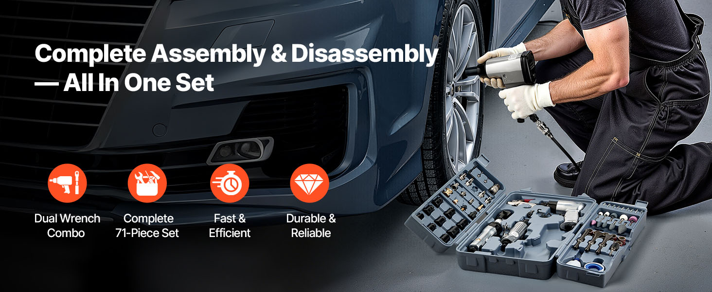 - Comprehensive 71-Piece Set: Features a 1/2" air impact wrench, 3/8" air ratchet wrench, 1/2" air die grinder (22000 RPM), 4500 BPM air hammer, air blow gun, and a complete range of accessories — perfect for removing lug nuts, detailed grinding, effective hammering, and thorough dust removal.