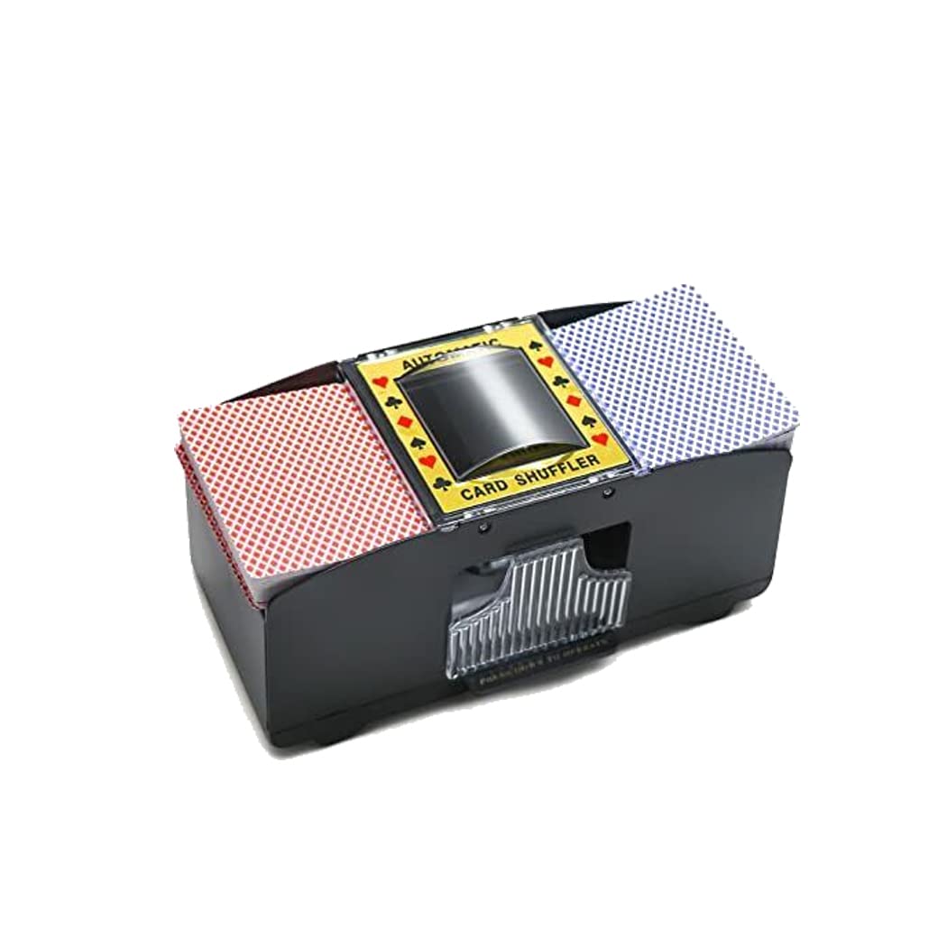 Oshide - Automatic Card Shuffler playing card uno Texas poker games. The automatic card mixer is your convenient solution for shuffling up to 2 decks of cards effortlessly. With just the press of a button, you can automatically shuffle your cards and the operation can be stopped at any time. Powered by 4 AA batteries (not included) this electronic card shuffler is perfect for various occasions whether it's poker rummy skat or other card games. Say goodbye to disputes with fellow card players about the fairness of shuffling – this practical card shuffling machine ensures unbiased results. Simply insert the cards into the two openings and they'll be thoroughly mixed before emerging from a single compartment. Experience the ease of automatic card shuffling with the push of a button. This sleek card mixer comes in 2 decks. Black