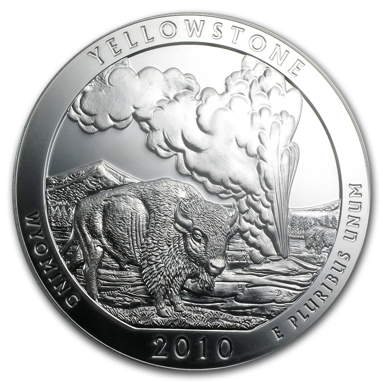 - Reverse: Image of a bison in front of Old Faithful, surrounded by Yellowstone, Wyoming, E Pluribus Unum and the date.