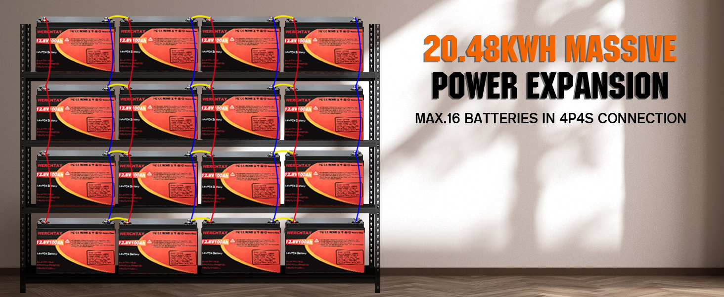 【Advanced Technology】WERCHTAY LiFePO4 battery possesses industry-leading technology and is manufactured with advanced technology in the industry. This model has excellent and reliable performance with sufficient battery capacity, supporting battery expansion for up to 4 series & 4 parallel and suitable for electric energy storage.