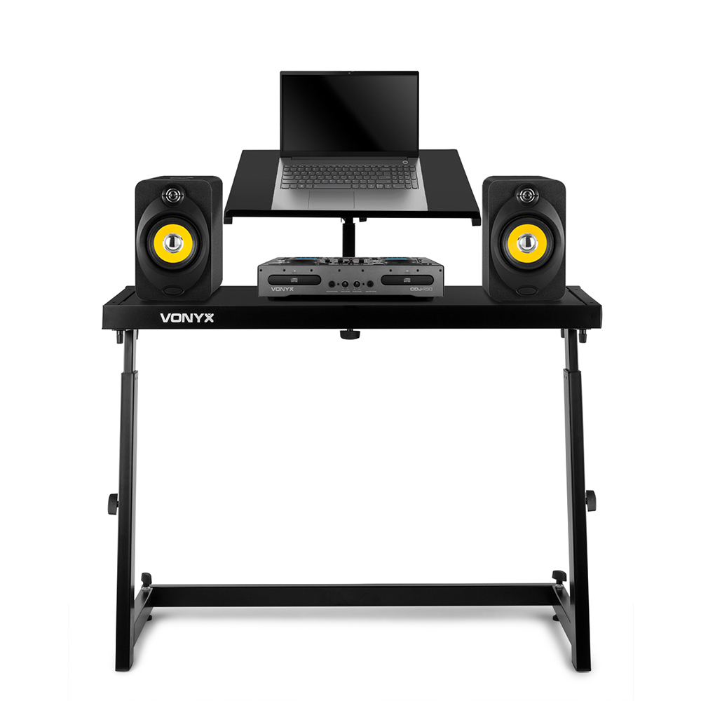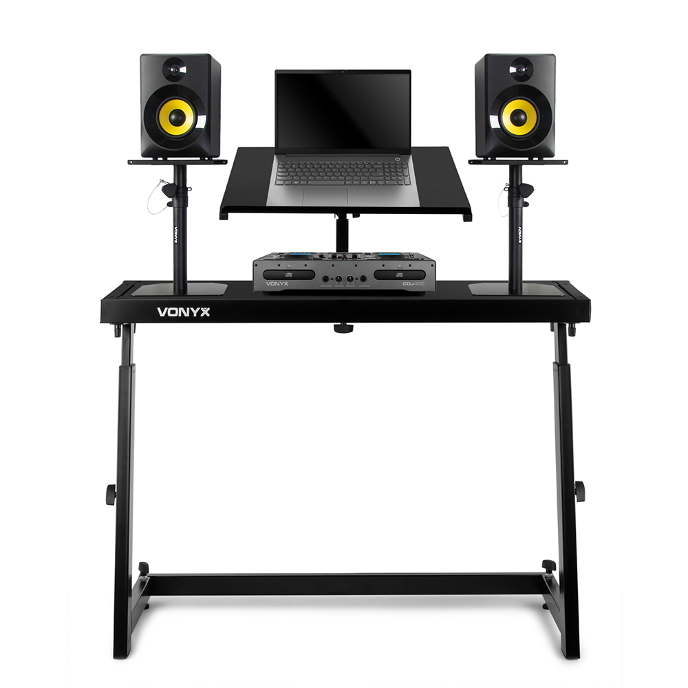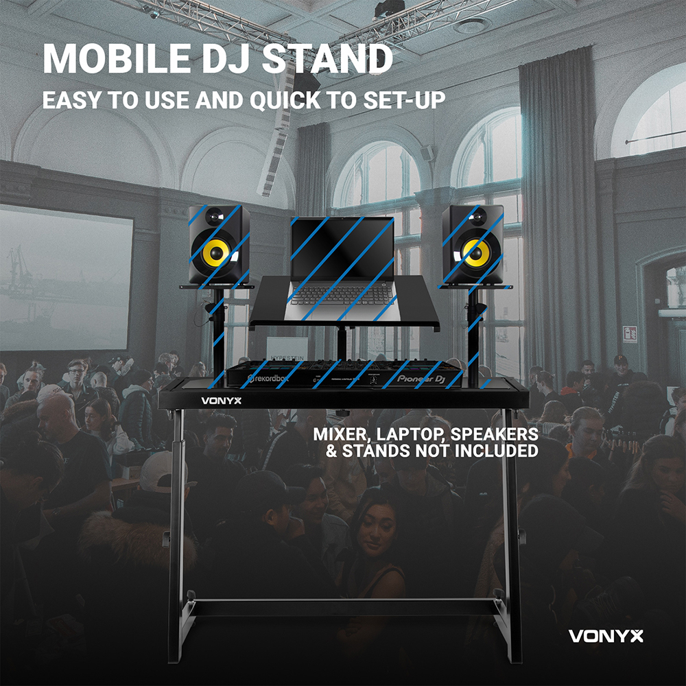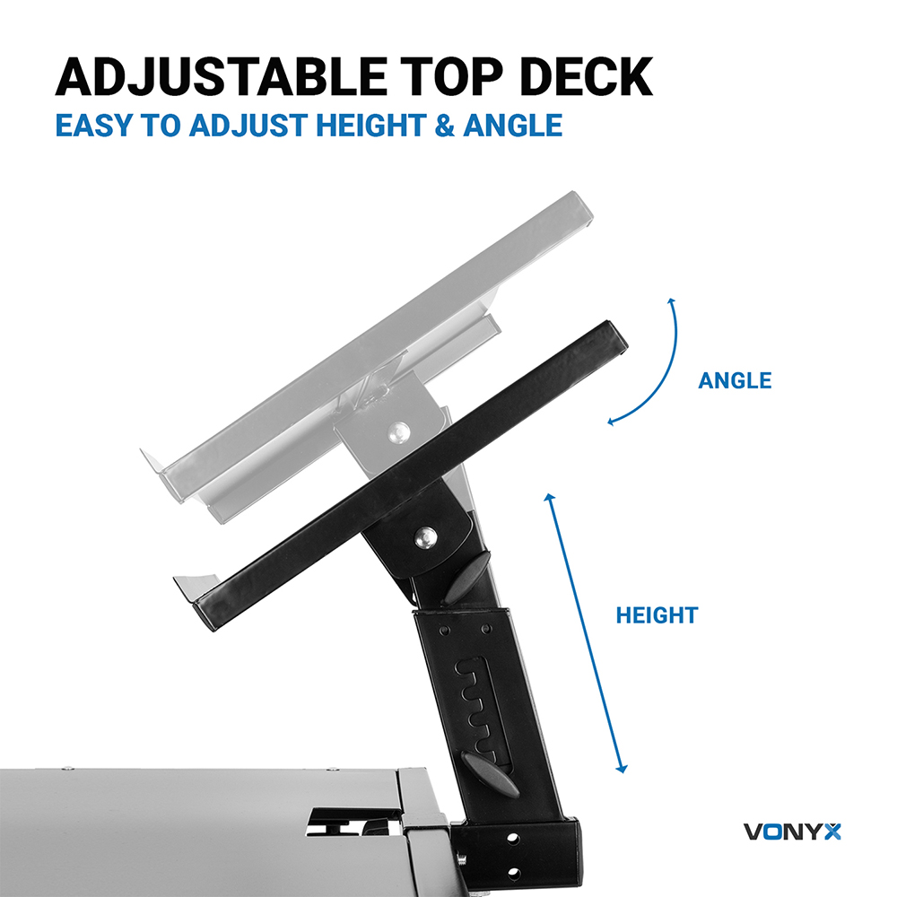 Built with your needs in mind, this package is brought to you by Electromarket. Package Includes 1x Vonyx 180.037 DJ Turntable Stand GGA4002 - Vonyx Mobile DJ Deck Stand This mobile DJ stand is ideal for mixers, decks, controllers, laptops or other DJ-equipment. The mobile DJ stand is easy to set-up and build out of strong material. The mobile DJ stand has a nice black finish and is fully in height adjustable. The adjustable deck is ideal for your laptop and other small equipment. Features