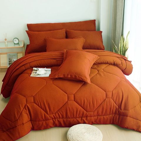 Transform your bedroom effortlessly with the HIG Uptown 8-piece comforter set in terracotta. This all-in-one bedding ensemble includes a comforter, two pillow shams, two pillowcases, a flat sheet, a fitted sheet with 14-inch deep pockets, and a body pillowcase, providing everything needed for a cohesive and stylish look. Made from 100% brushed microfiber fabric filled with a soft polyester down alternative, the set delivers exceptional softness and warmth while remaining lightweight and breathable for year-round use. The comforter features four corner tabs for easy attachment to duvet covers or can be used alone. The fitted sheet is designed with 360-degree elastic to keep it securely in place on mattresses up to 14 inches deep. Additionally, the stain-resistant fabric simplifies maintenance by allowing machine washing on gentle cycles without bleach. Ideal for adults seeking both comfort and style, this set enhances bedroom decor with its classic solid terracotta color and honeycomb quilted pattern that adds modern elegance.