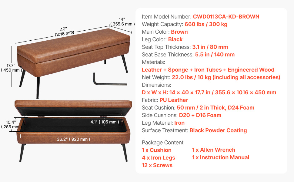 Reinforced Weight Support: Made with sturdy rubberwood legs and a solid wood frame, this leather storage bench provides strong, long-lasting support. Weight capacity: up to 660 lbs (300 kg). Designed for everyday use without wobbling or sagging. Bench dimensions: 14 x 40 x 17.7 in / 355 x 1015 x 450 mm