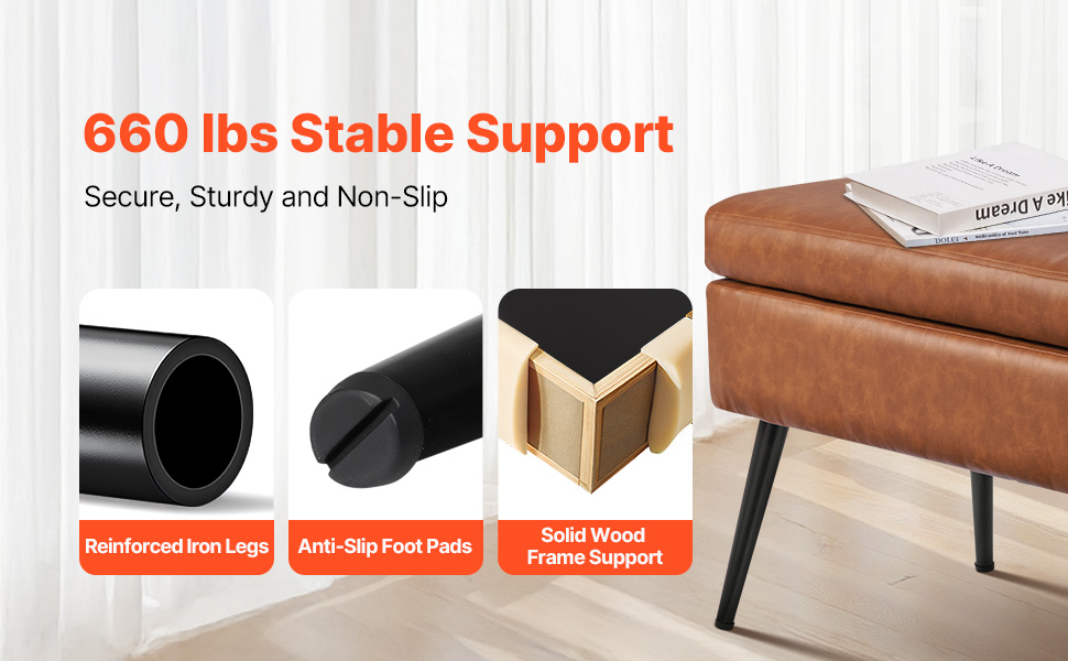 Reinforced legs with non-slip pads guard your floors and enhance stability. Combined with a solid wood frame and cushioned hinges, the multi-layer structure provides stronger load-bearing and securer storage and seating.