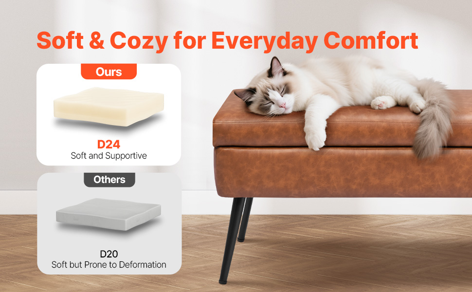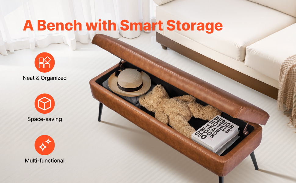 Smooth PU Leather: Wrapped in premium PU leather with a silky texture and refined stitching. Water-resistant and easy to wipe clean—great for busy homes. Our bed storage bench adds a modern, refined touch to your bedroom décor