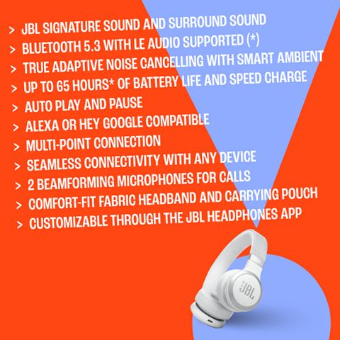 [JBL Live 670NC headphones deliver powerful JBL Signature Sound in a comfortable on-ear headband style. When you're deep in your flow, True Adaptive Noise Cancelling with Smart Ambient technology keeps you free from distractions. Then, when you want to keep an ear open to the world around you, you can stay aware as you continue listening to your favorite playlist—or even have a conversation without taking the headphones off. Easily access your preferred voice assistant with a tap on the ear cup to cue up a song, text your friend, check the weather, and much more. You’ll enjoy 65 hours (50 hours with BT+ANC on) of music streaming. And if you still need more, a 5-minute speed charge gets you another four hours. The JBL Live 670NC can connect with two Bluetooth devices simultaneously, so you’ll never have to miss a call, even if you’re watching a movie on your tablet.]