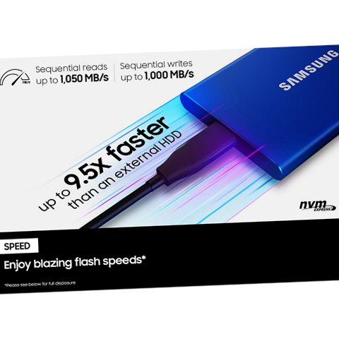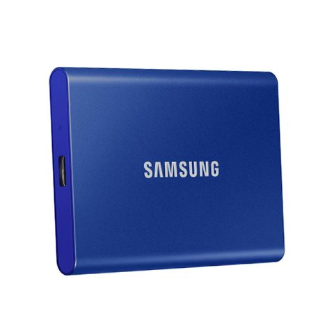 The SAMSUNG T7 Portable SSD 1TB Indigo Blue, Up-to 1,050MB/s, USB 3.2 Gen2 (MU-PC1T0H/AM) is the next standard in external storage. With transfer rates up to 9.5x faster than traditional external hard drives and read/write speeds up to 1000+ MB/s, you can move massive files around with unparalleled ease and fluidity. It's sleek, shock-resistant design is uncommonly durable, capable of withstanding drops from up to 6ft, so you can take it on-the-go with complete peace of mind. The 1TB capacity offers vast storage space for your files, while the advanced thermal solution ensures cool operation even at high speeds. This Samsung T7 portable SSD has 256-bit AES encryption for securing your data against unauthorized access, and the slim, lightweight design provides easy portability.