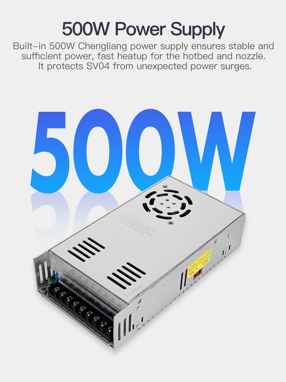 - Built-in 500W Chengliang power supply ensures stable and sufficient power, fast heatup for the hotbed and nozzle. It protects SV04 from unexpected power surges.Any questions or issues about the product please feel free to contact us. We will try our best to help you resolve it